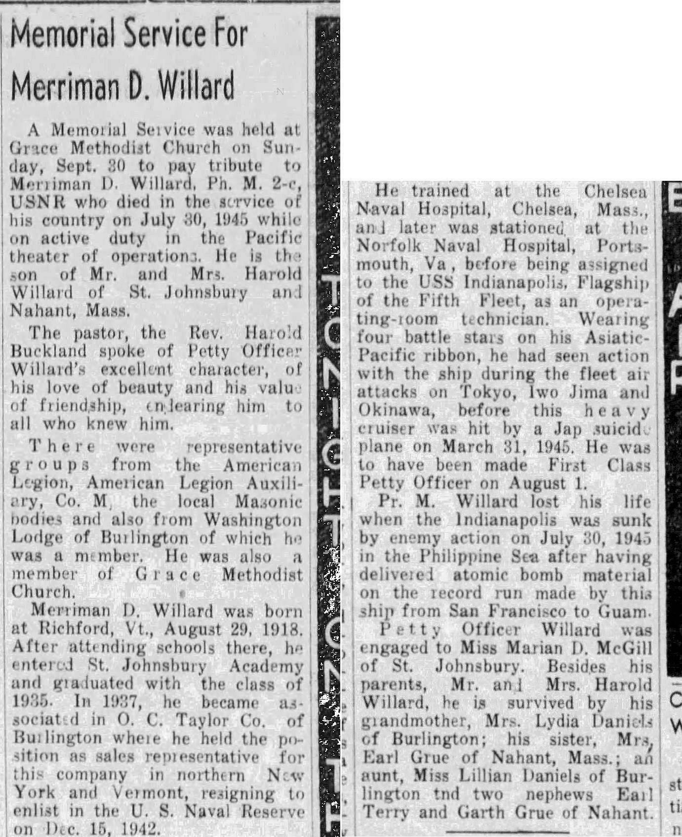 Danny was survived by his fiancee, Marion D. McGill of St. Johnsbury, Vermont; his parents, Harold and Olga Willard; his grandmother, Lydia Daniels, all of Burlington, Vermont; as well as a sister, Mrs. Herbert (Marjorie) Thompson, and a son, Earl Grue and daughter, Susan E. Harp of Pocatello, Idaho.