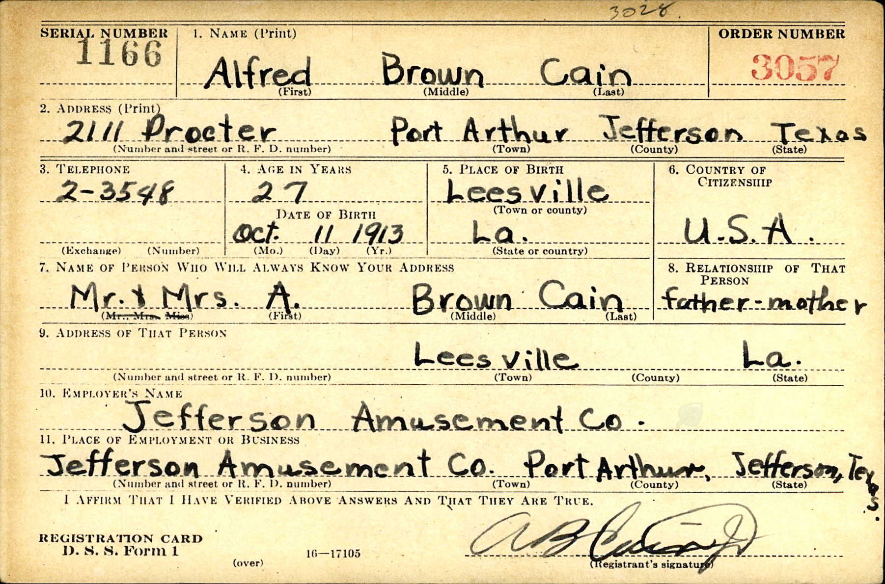 Name: Alfred Brown CAIN Rank / Rating: RT3-Radio Technician Third Class Service #: 624 15 79 DOB: Oct 11, 1913 From: Leesville, LA Parents: Mr. and Mrs. A. Brown Cain Went Aboard: Apr 13, 1942 Age When Ship Went Down: 31 years, 9 months, 19 days Spouse: Children: Grandchildren: Bio Submitted By: Admin Date Posted: Apr 10, 2026