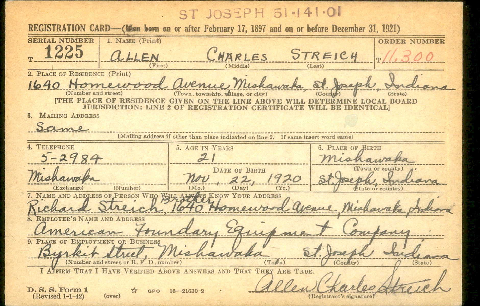 Allen was born Nov 22, 1920, the oldest child of Leo Charles and Mary Wheeler Streich of Mishawaka, St. Joseph, IN. His father was born in Indiana and his mother in Chicago, IL. He had two brothers, Paul and Richard and two sisters, Marjorie Eva and Anna Marie. His maternal grandmother was Mrs. Anna Wheeler of North Judson, IN.