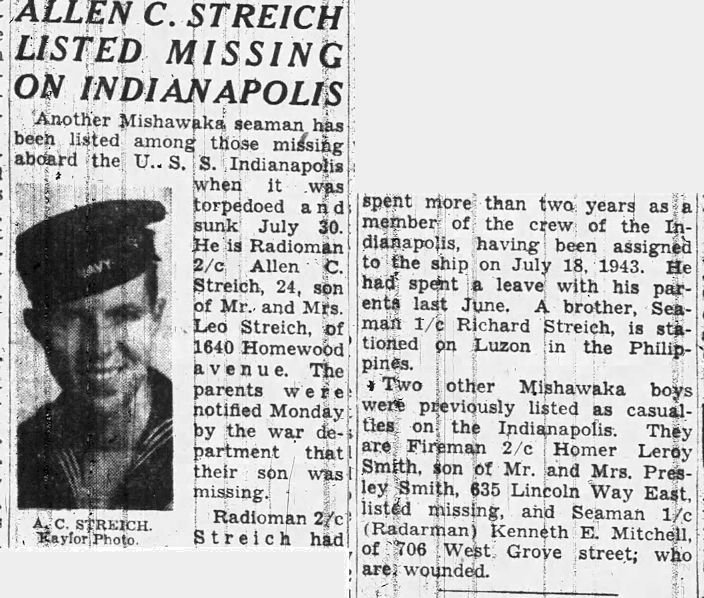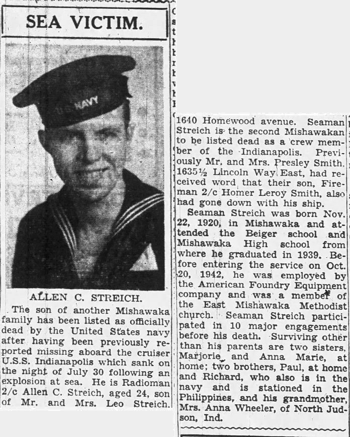 The South Bend Tribute, (IN), Sun, Oct 28, 1945, p. 31; citing Streich KIA