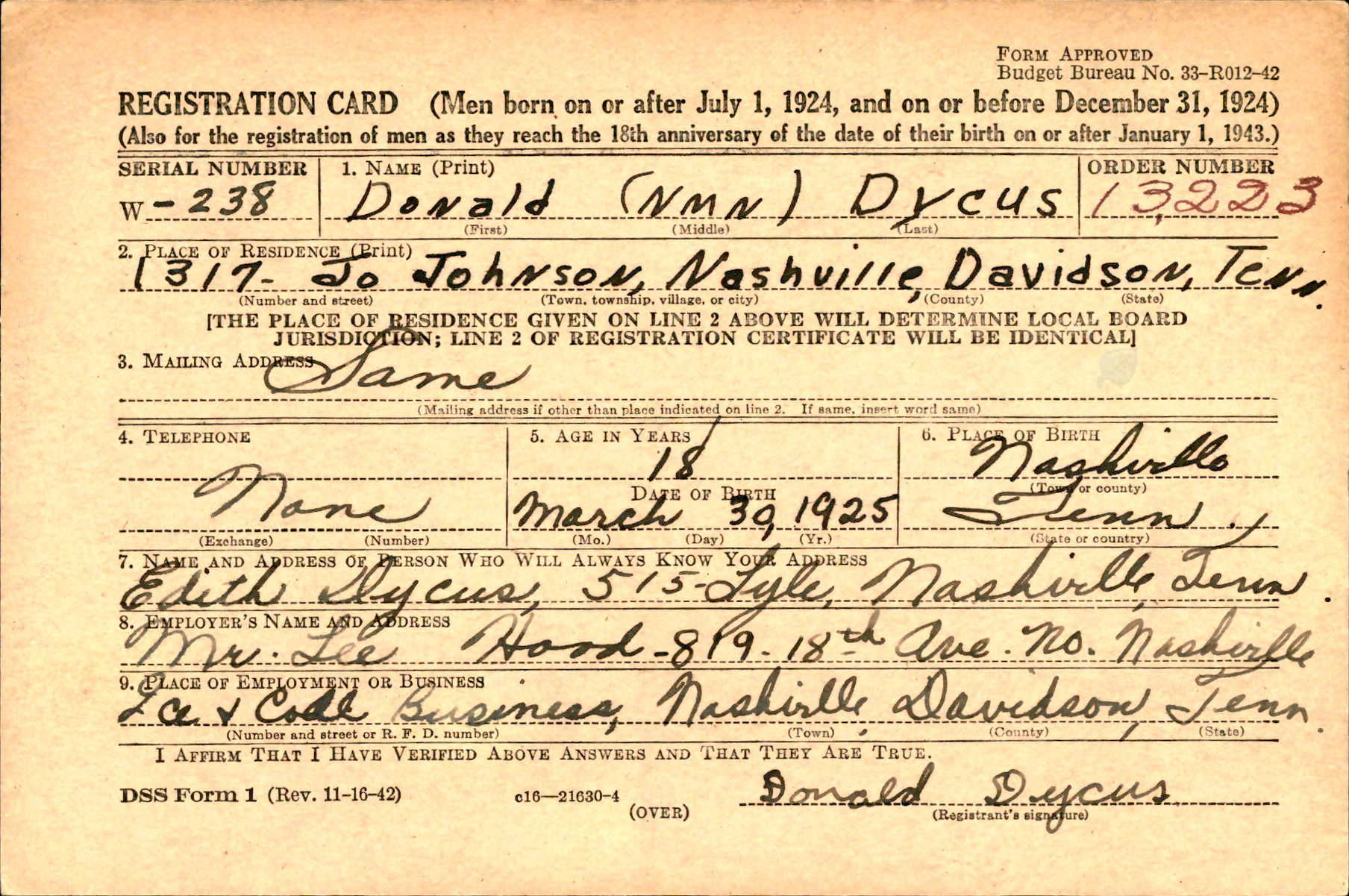 Name: Donald DYCUS Rank / Rating: S2-Seaman Second Class Service #: 845 64 56 DOB: Mar 30, 1925 From: Nashville, TN Parents: Edith Dycus (Mother) Went Aboard: Oct 08, 1943 Age When Ship Went Down: 20 years, 4 months, 0 days Spouse: Children: Grandchildren: Bio Submitted By: Admin Date Posted: Apr 18, 2026
