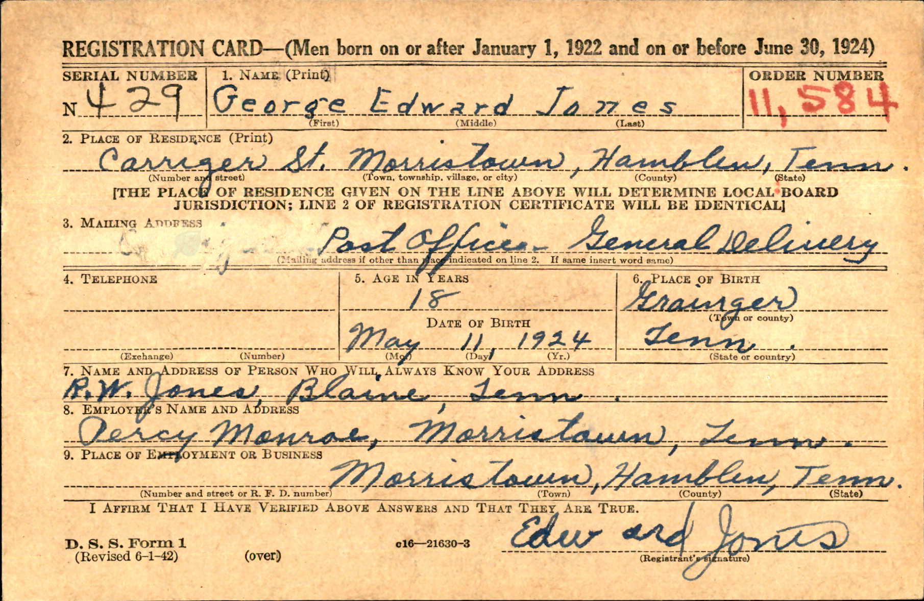Edward registered for the draft on 30 June 1942 after he turned 18. He listed his father, R. W. Jones, as the person who would always know how to locate him. When he registered, Edward was living in Morristown, Hamblen Co., TN and working for Percy Monroe. The type work he was engaged in is not known. Note that he signed his name "Edward Jones", dropping his first name.