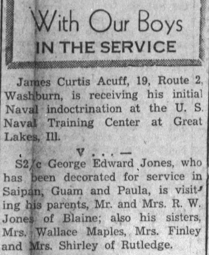 Grainger County News, (Rutledge, TN), Wed, Oct 10, 1945, p. 1; citing George E. Jones is Reported Dead