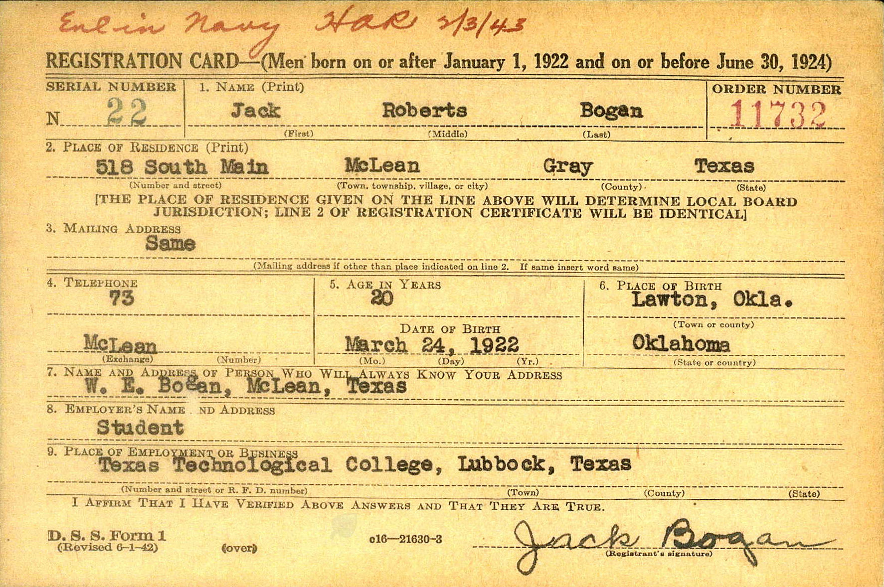 Name: Jack Roberts BOGAN Rank / Rating: RM1-Radioman First Class Service #: 617 81 95 DOB: Mar 24, 1922 From: McLean, TX Parents: Went Aboard: May 19, 1944 Age When Ship Went Down: 23 years, 4 months, 6 days Spouse: Children: Grandchildren: Bio Submitted By: Admin Date Posted: Apr 08, 2026