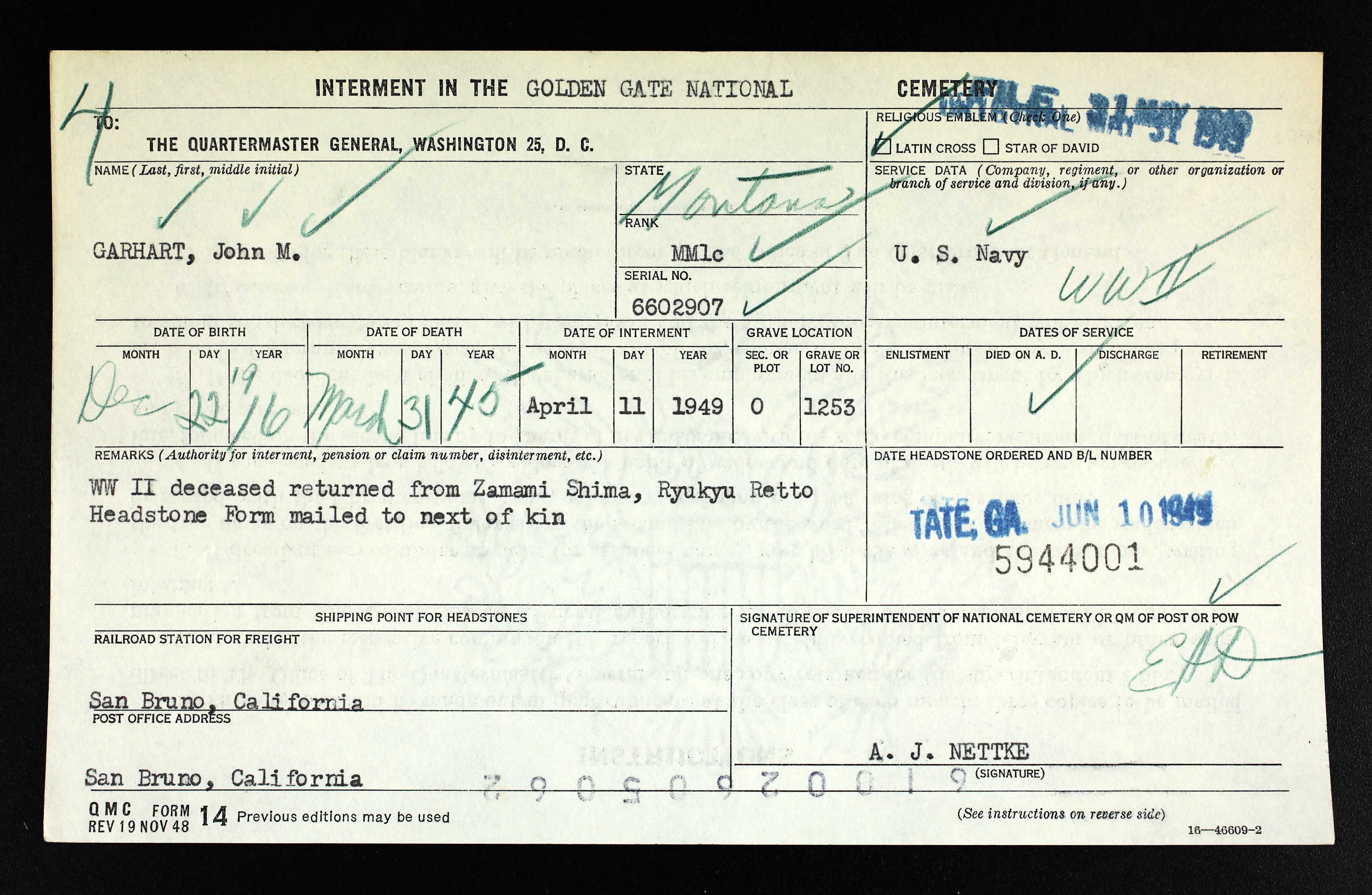 The Butte Daily Post, (Montana), Mon, Feb 21, 1949, p. 2; citing return of remains to US.