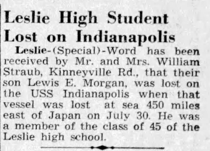 Name: Lewis E. MORGAN Rank / Rating: S2-Seaman Second Class Service #: 314 93 14 DOB: 1927 From: Leslie, MI Parents: William and Hazel Marie Straub Went Aboard: Jun 23, 1945 Age When Ship Went Down: 18 Spouse: Children: Grandchildren: Bio Submitted By: Admin Date Posted: Jul 30, 2025