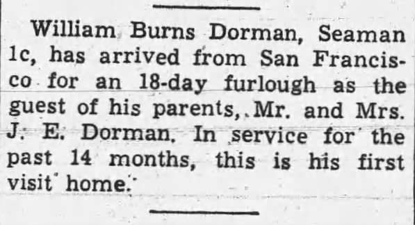 The Selma Times-Journal, (AL), Wed, Aug 11, 1943, p. 8; citing home on 18 day furlough
