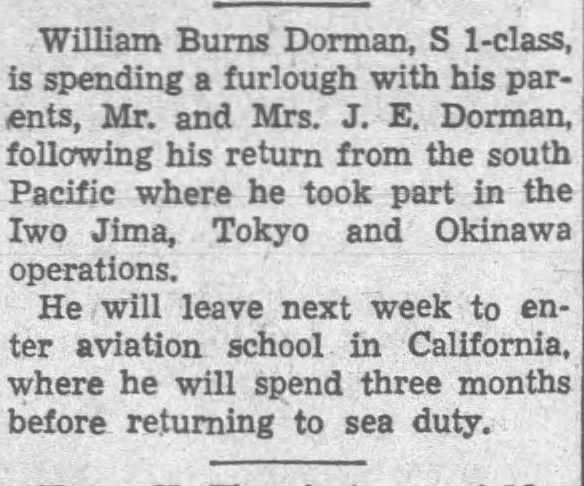 The Selma Times-Journal, (AL), Sun, May 20, 1945, p. 8; citing home on furlough.