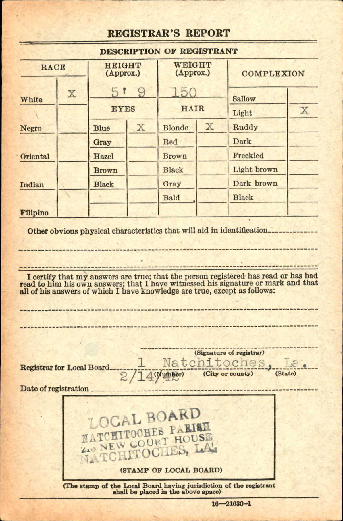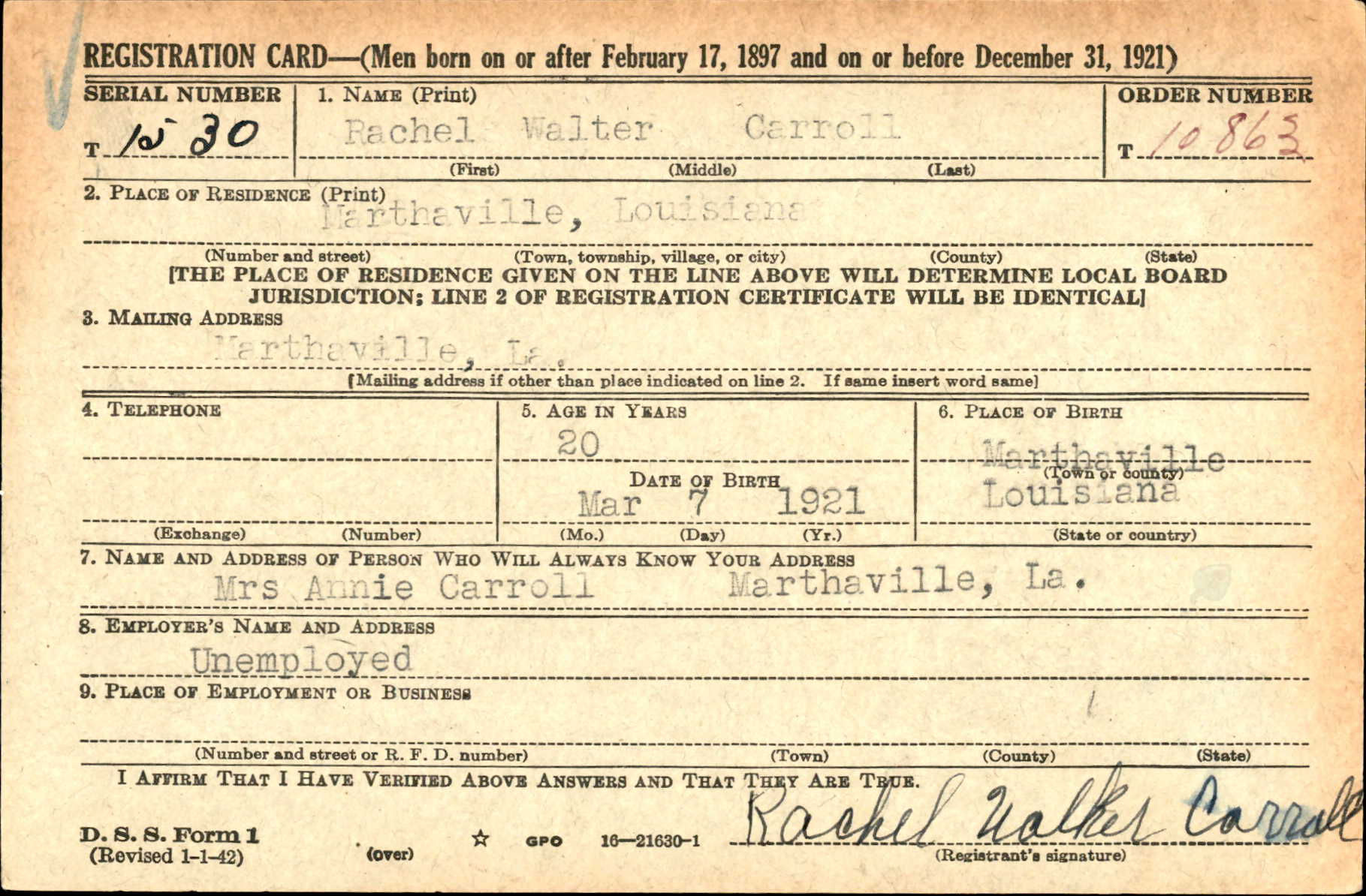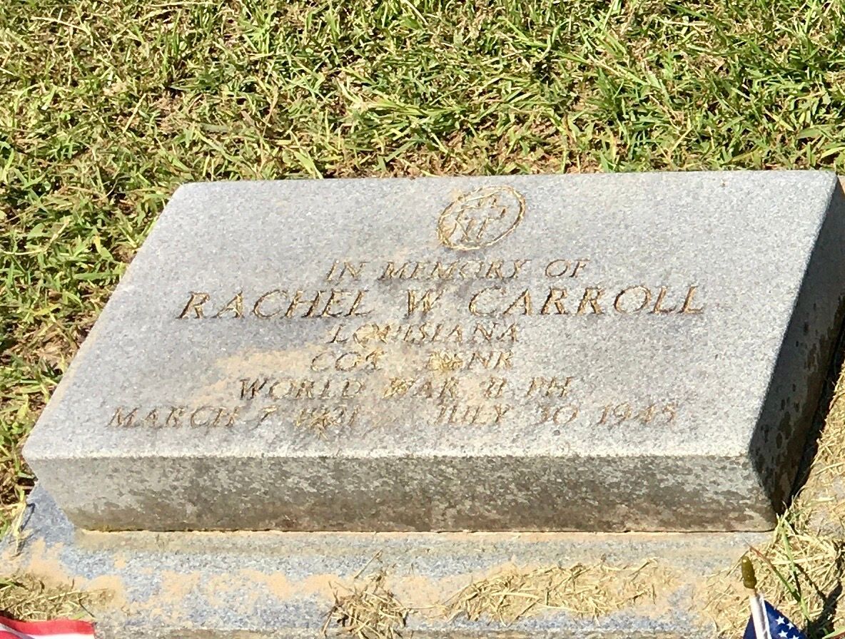 Name: Rachel Walker CARROLL Rank / Rating: COX-Coxswain Service #: 645 02 31 DOB: Mar 07, 1921 From: Marthaville, LA Parents: Rufus Wade Carroll Sr. and Annie Delilah Carroll Went Aboard: Nov 26, 1942 Age When Ship Went Down: 24 years, 4 months, 23 days Spouse: Children: Grandchildren: Bio Submitted By: Admin Date Posted: Apr 10, 2026