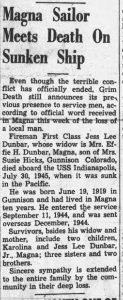 Fireman Second Class Jess Lee Dunbar was born on June 19, 1919 in Gunnison, Colorado. His mother, Mrs. Susie Hicks was recorded as living in Gunnison at the time of his passing on July 30, 1945. as a result of the sinking of USS Indianapolis.