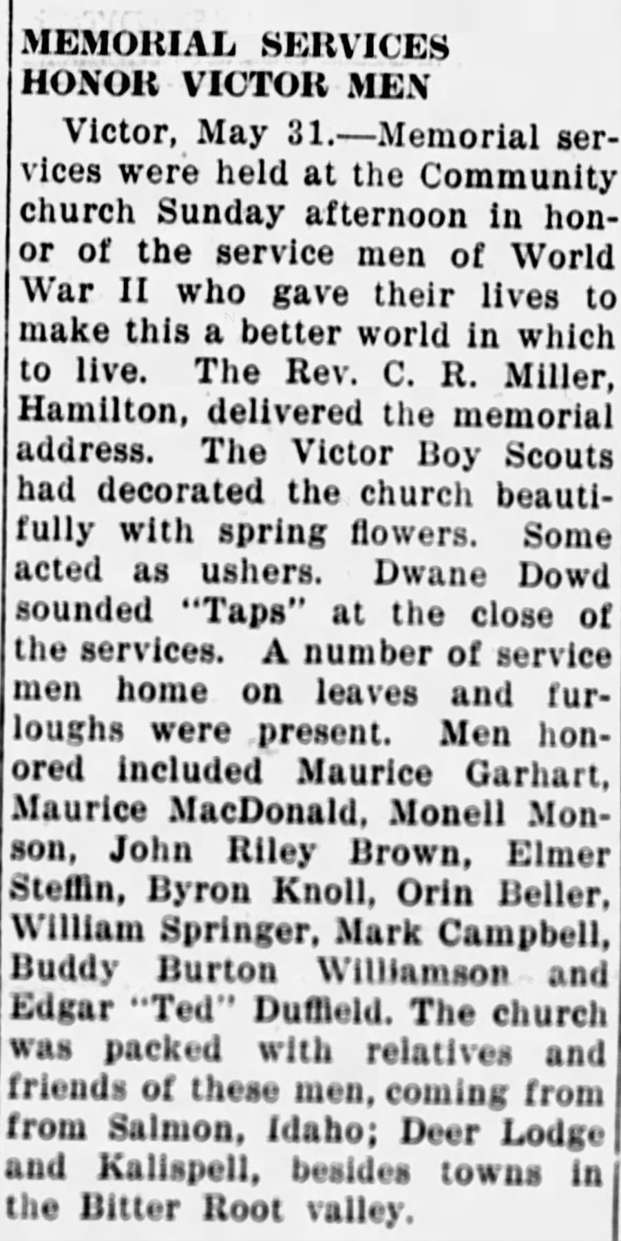 Ravalli Republic (Hamilton, MT), Thur, May 31, 1945, p. 1; citing local memorial service that included Maurice Garhart