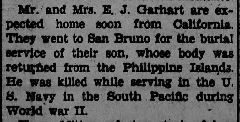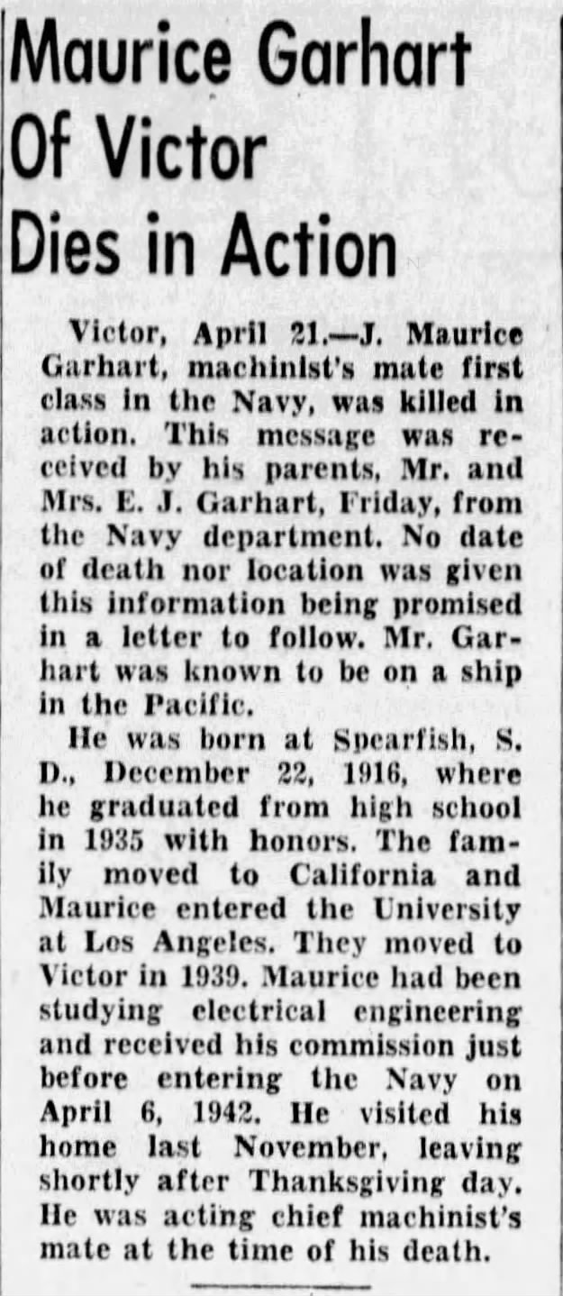 Source CreditsLead Daily Call, (Lead, South Dakota), Fri, Apr 27, 1945, p. 1; citing the death of Garhart