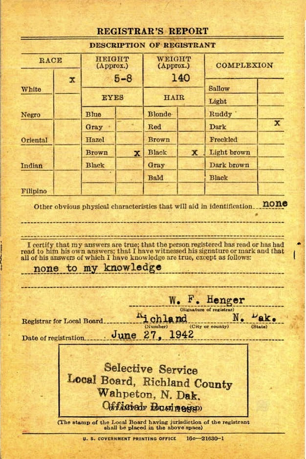 Note that Daniel's draft card shows the name "Donald" Albert Baker from Hankinson, Richland Co., ND. He registered at Wahpeton, Richland Co., ND on June 27, 1942. His primary contact was O. H. Baker, RR, Hankinson.