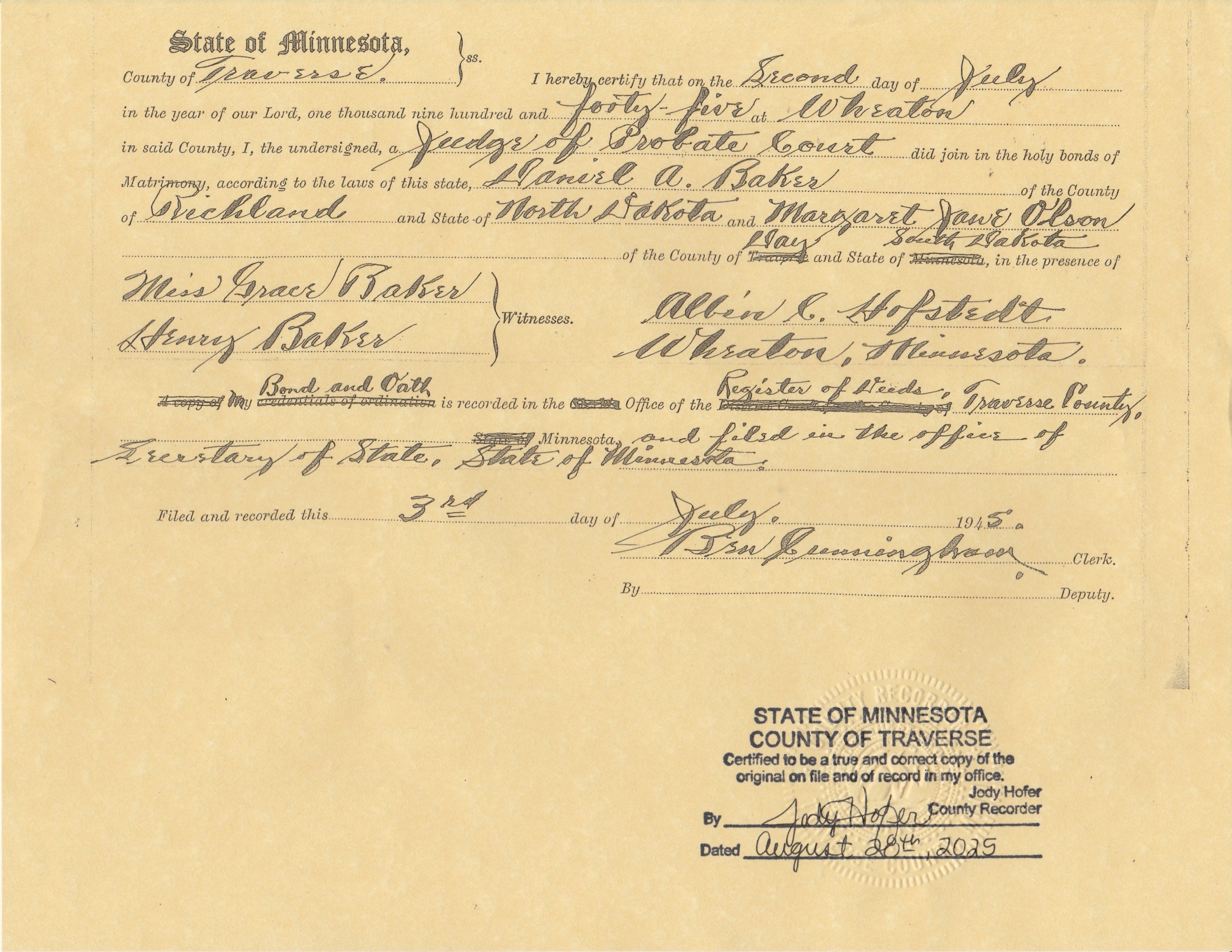 Daniel was granted furlough as evidence by his marriage on July 2, 1945 in Wheaton, Traverse Co., MN. The marriage certificate, below, shows Daniel A. Baker of Richland Co., North Dakota, married Margaret Jane Olson of Day Co., South Dakota.