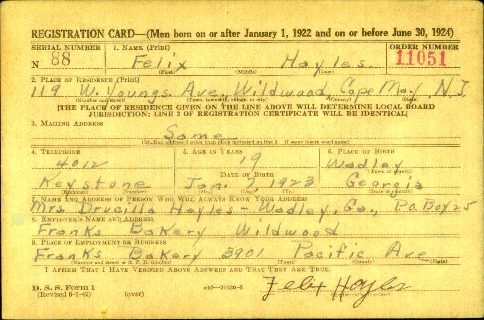 Felix Hayles was born in the rural town of Wadley, Georgia on 7 January 1923. Felix moved to Cape May, New Jersey, and was working at Frank’s Bakery in Wildwood, NJ when he registered for the draft on 30 June 1942.