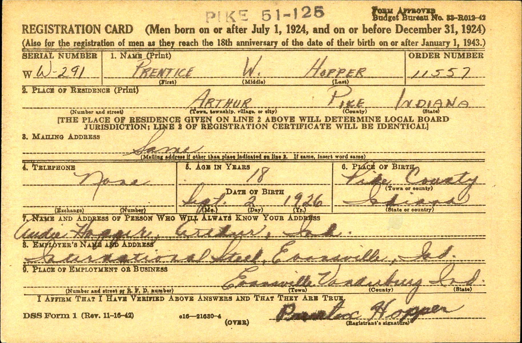 Prentice was the eighth child born to Virgil K. and Audie Bell Robling Hopper. He was born in Winslow, Pataka Township, Pike Co., IN on Sept 3, 1926. His father was a coal miner and his mother a housewife.(1)
