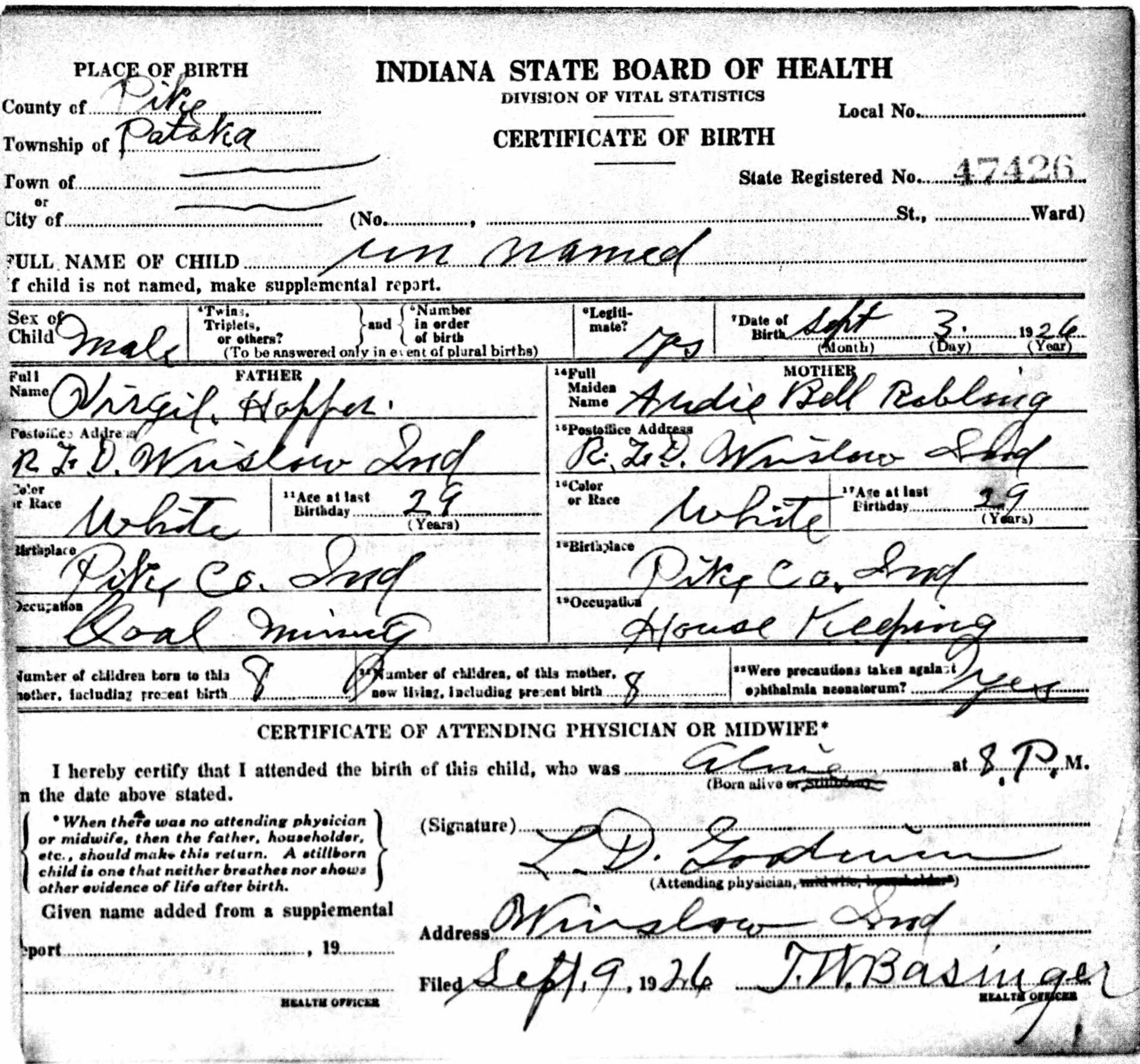 Source Credits(1) IN State Board of Health, Pike Co., Pataka Twsp., Winslow; Certificate of Birth, #47426; citing yet unnamed son, 8th child of Virgil and Audie Bell Robling Hopper.
