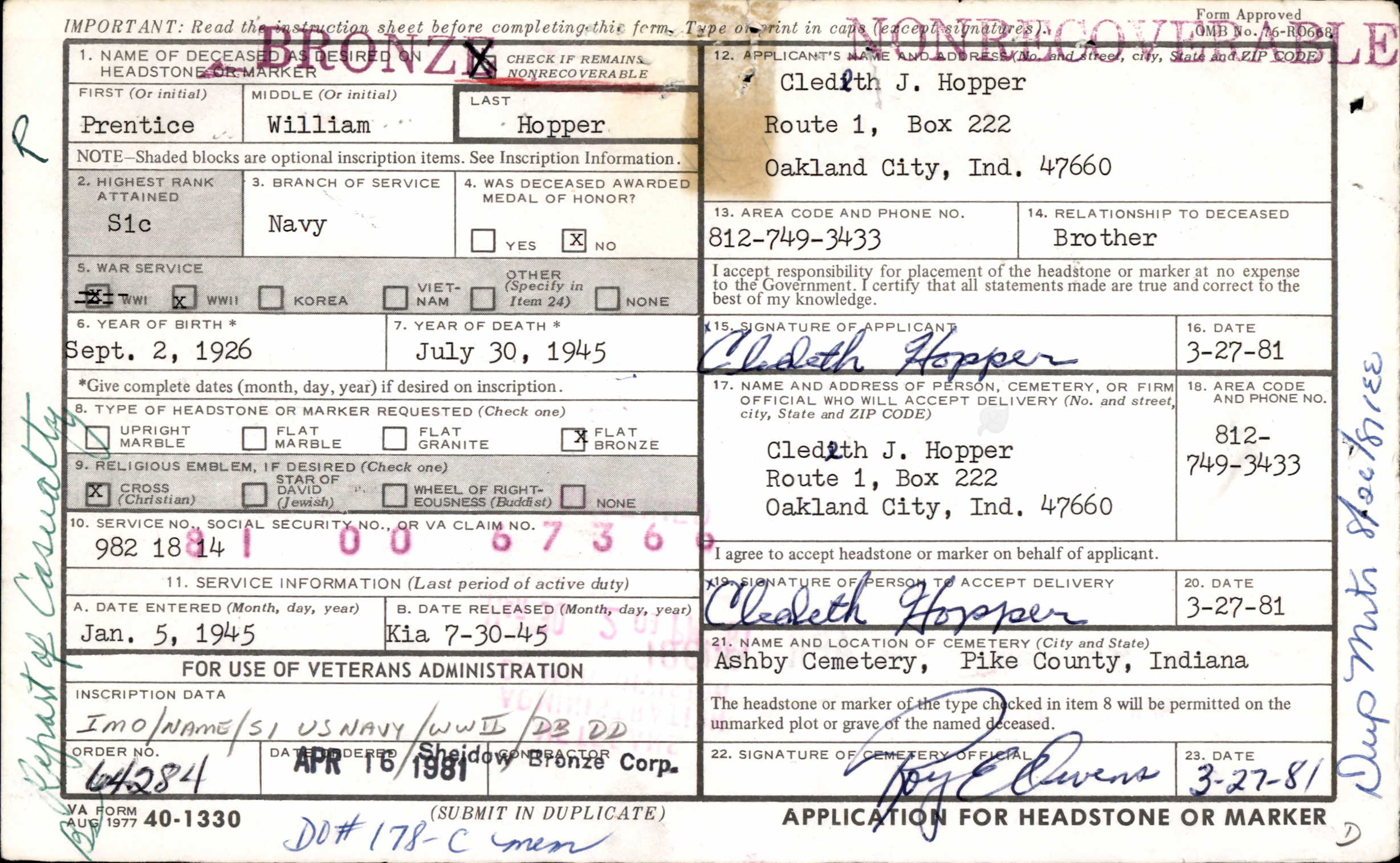 US Government, Department of Veterans Affairs, Application for Memorial Grave Marker; citing Prentice Hopper, 1981.