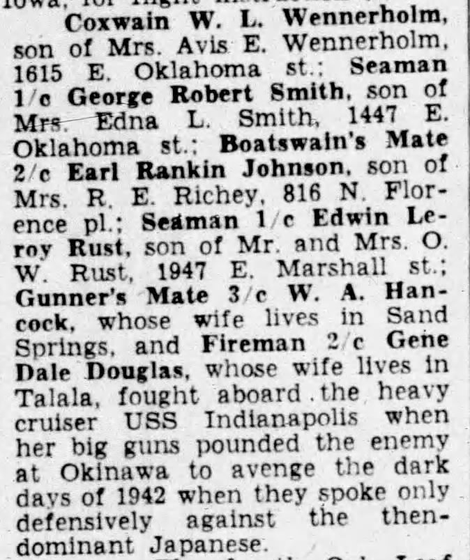 The Tulsa Tribune, Mon, July 16, 1945, p. 12; "Fighting Oklahomans", citing names of men from Tulsa, OK on board Indianapolis at Okinawa.