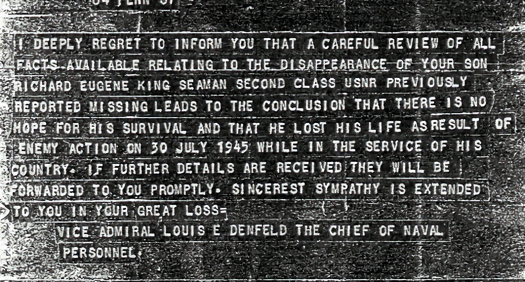 Richard was one of the eight crew members picked up and identified by USS French Monday August 6, 1945.