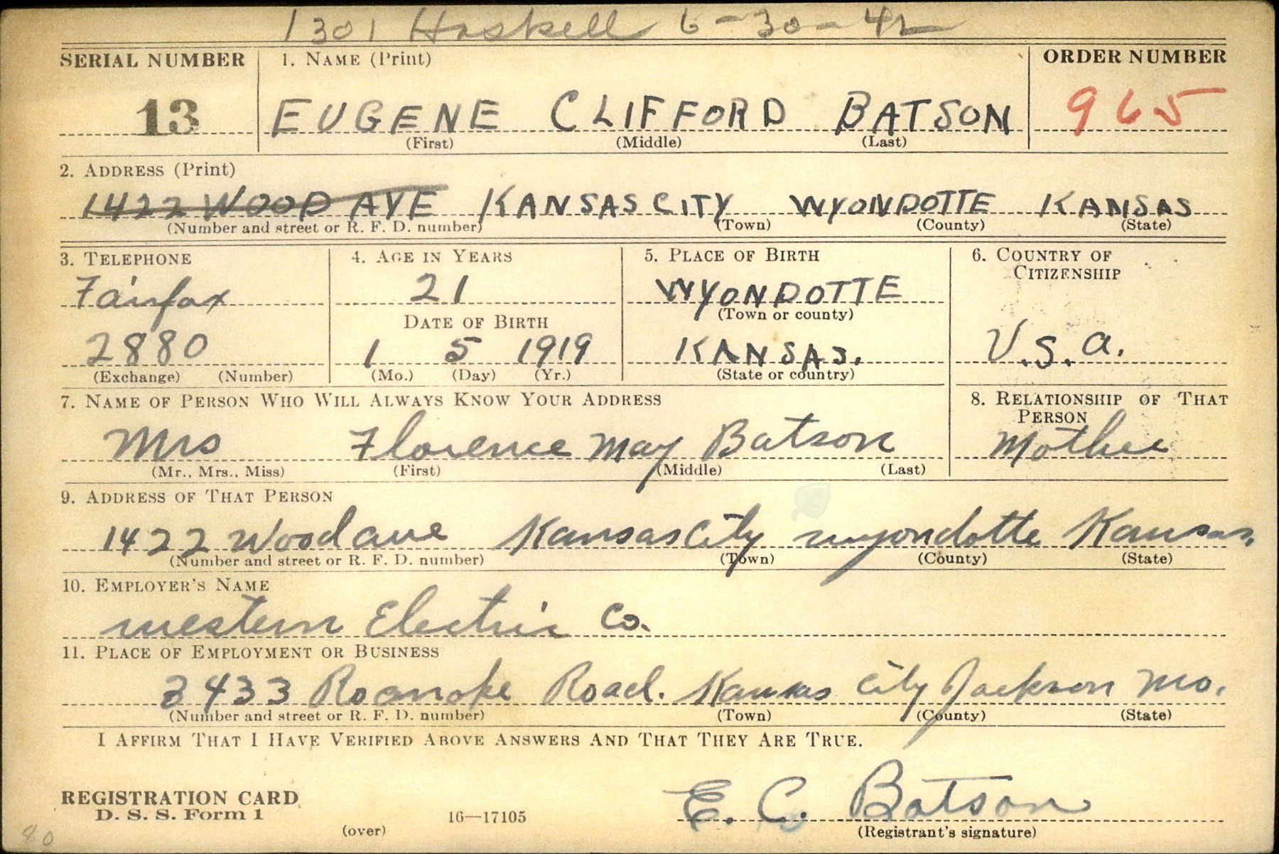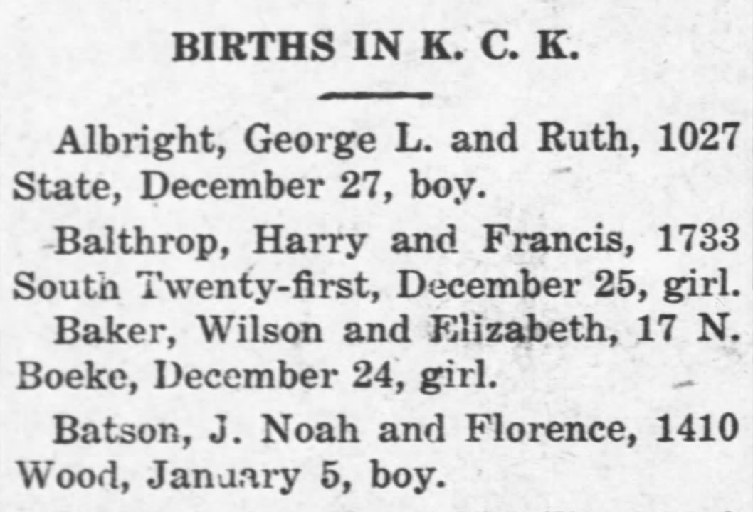 The Kansas City Kansan, Thur, Jan 9, 1919, p. 4; citing birth of Eugene to parents J. Noah and Florence Batson