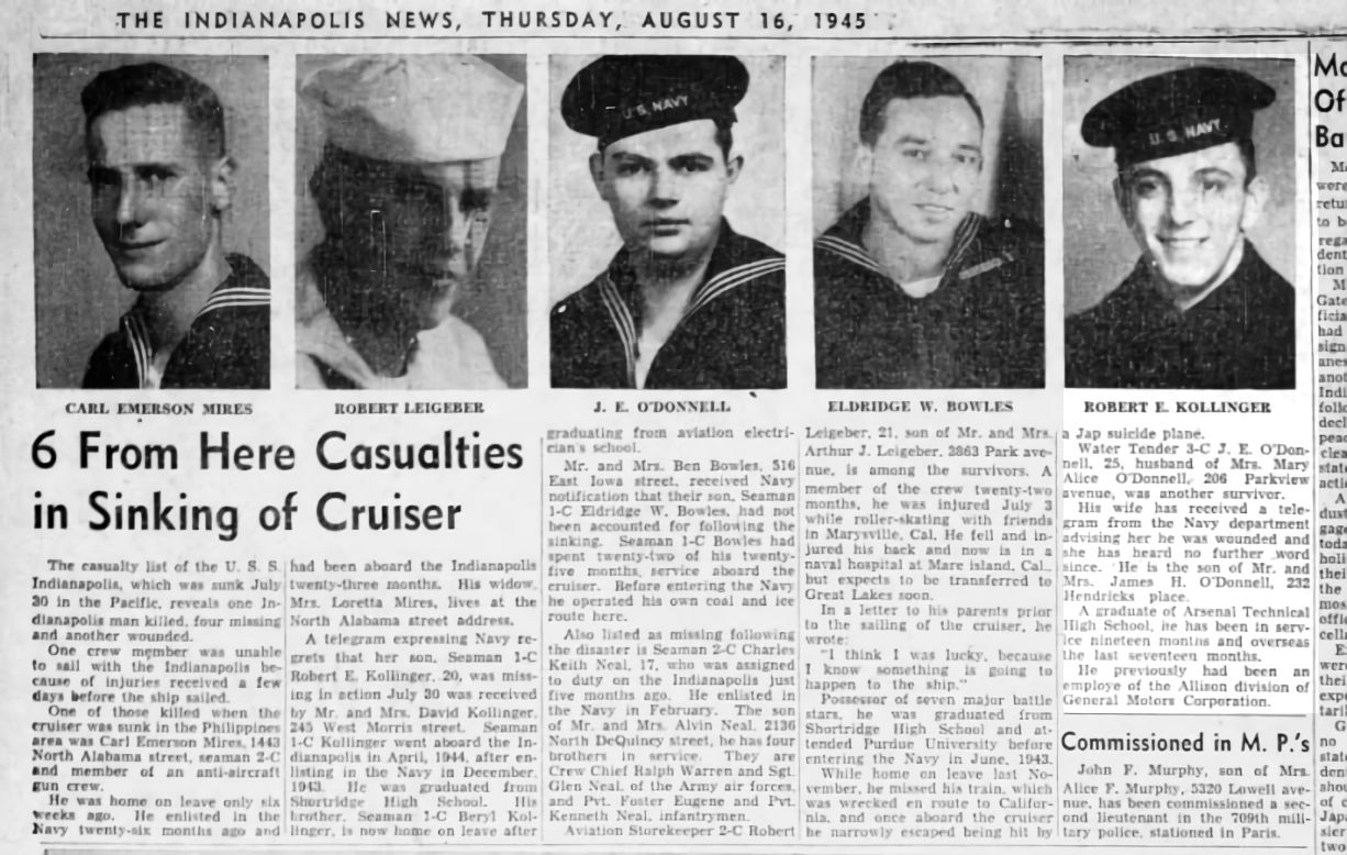 “ My uncle is still aboard the Indianapolis. . . Robert Eugene Kollinger. I never got to meet him being born in ’49. His loss was deeply felt by my grandparents (Robert’s parents), my mother (his sister Elaine) and their brother (Beryl) who also served in the USN (in the Pacific theater) during the war - surviving.