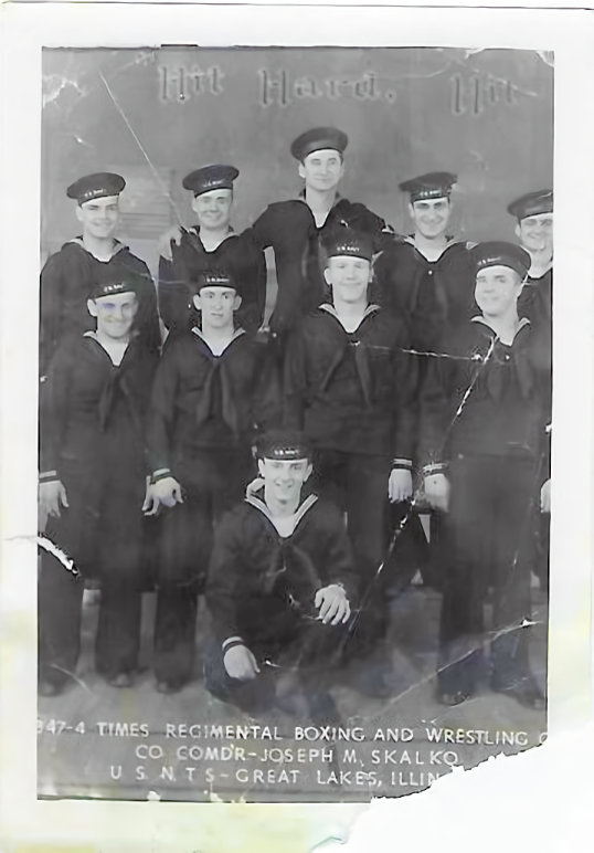 Robert registered for the draft on his birthday November 19, 1943 and enlisted for duty on February 12, 1944 being sent to Great Lakes Naval Training Center where he was active in the navy’s boxing group. Robert can be seen kneeling in the front of the group in the photo.