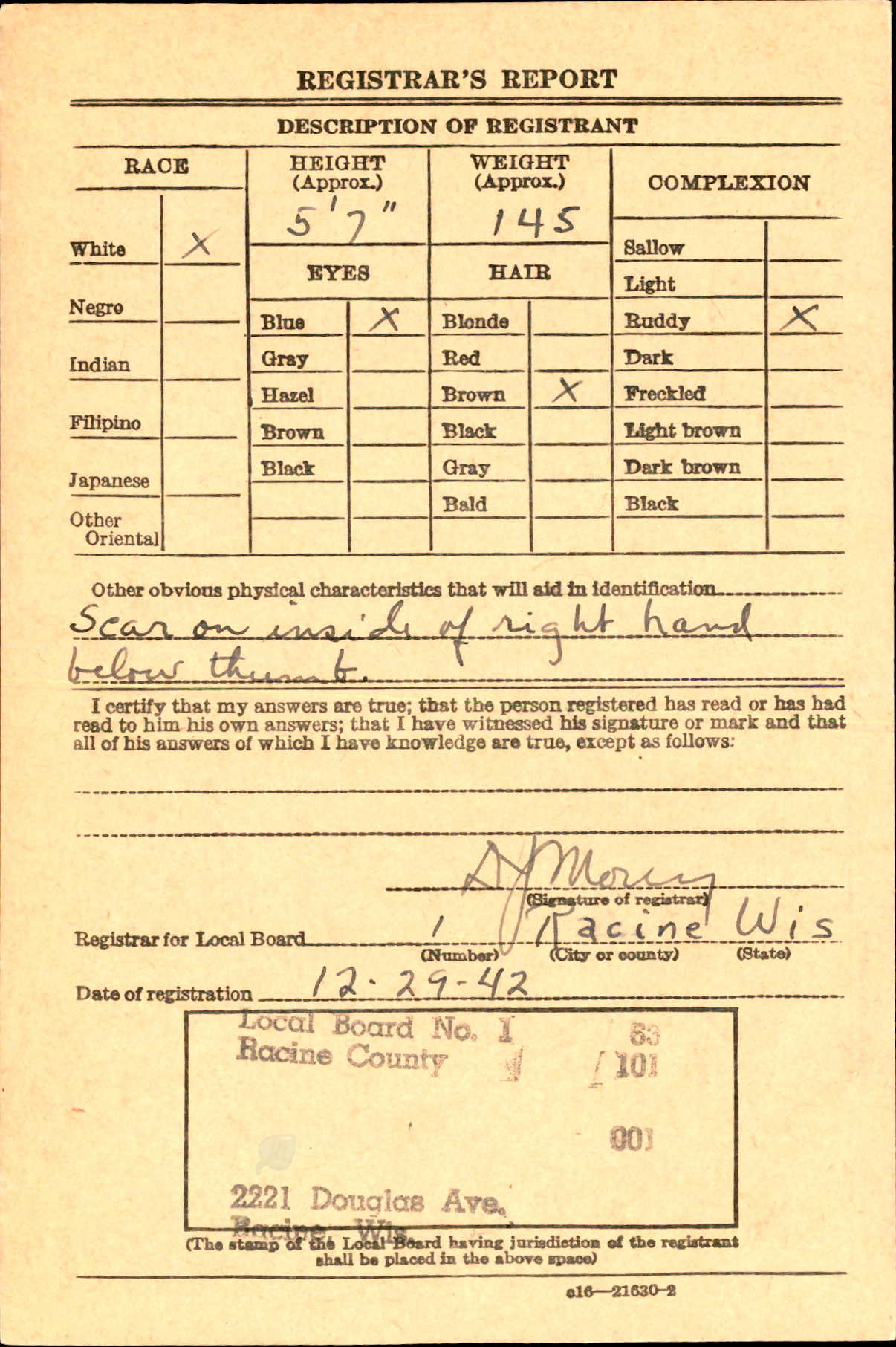 Richard registered for the draft on December 29, 1942 at age of 18. He enlisted in the US Navy on April 27, 1943 at Milwaukee, WI. After basic training, he went aboard USS Indianapolis CA-35 on December 23, 1943 at age 19. His rate was Seaman First Class.