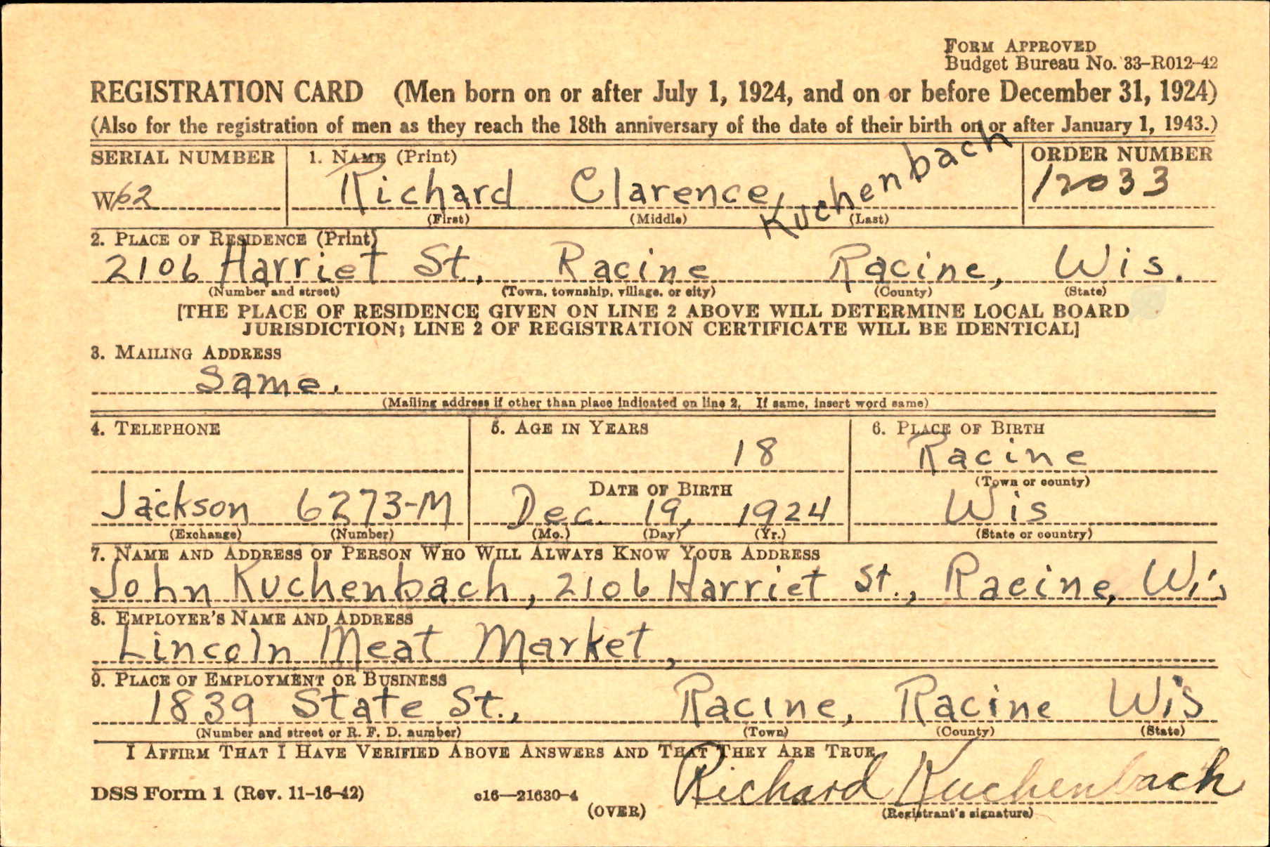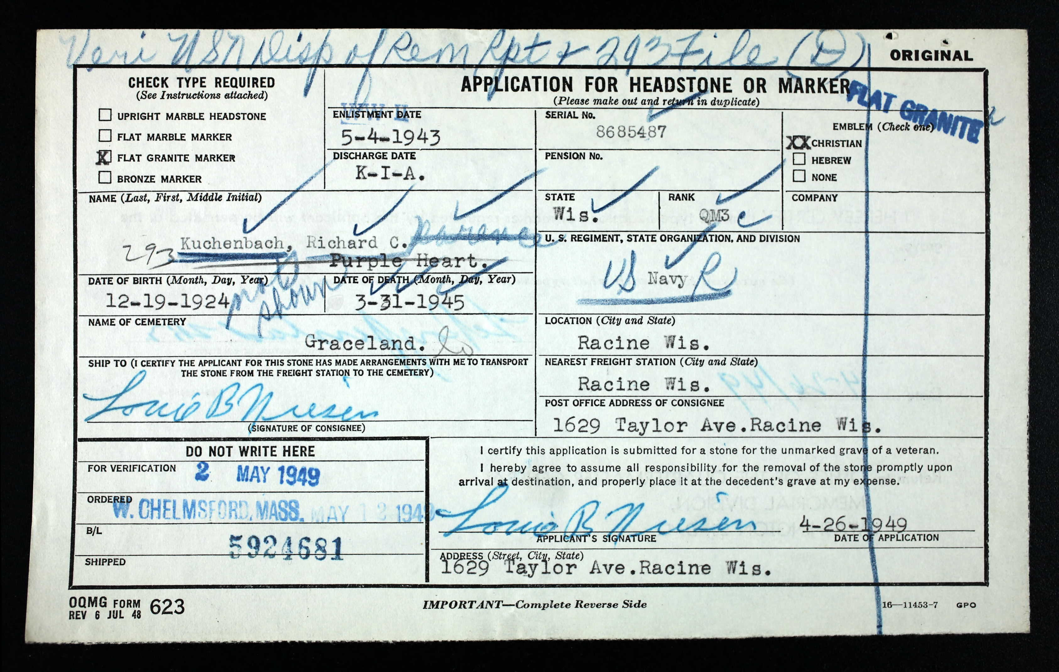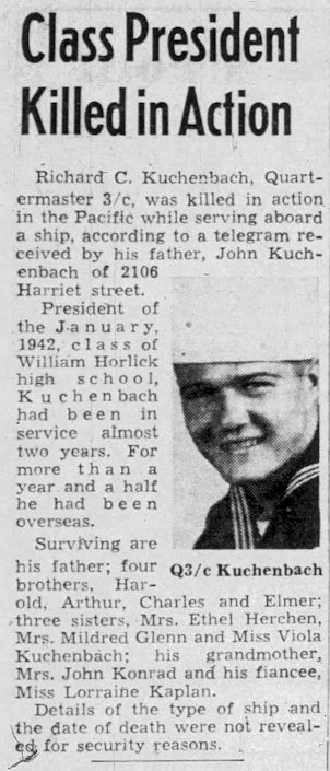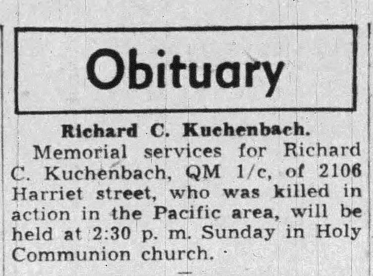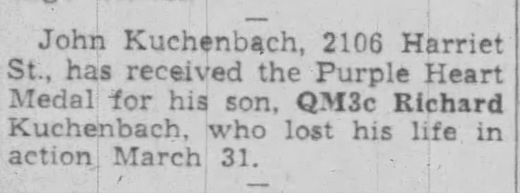 Quarter Master Third Class Clarence Kuchenbach was born on December 19, 1924 to John and Bertha Kuchenbach in Racine, Wisconsin. Richard was one of seven children. His siblings were brothers Harold, Art, Elmer and Charles; his sisters were Ethen and Viola.