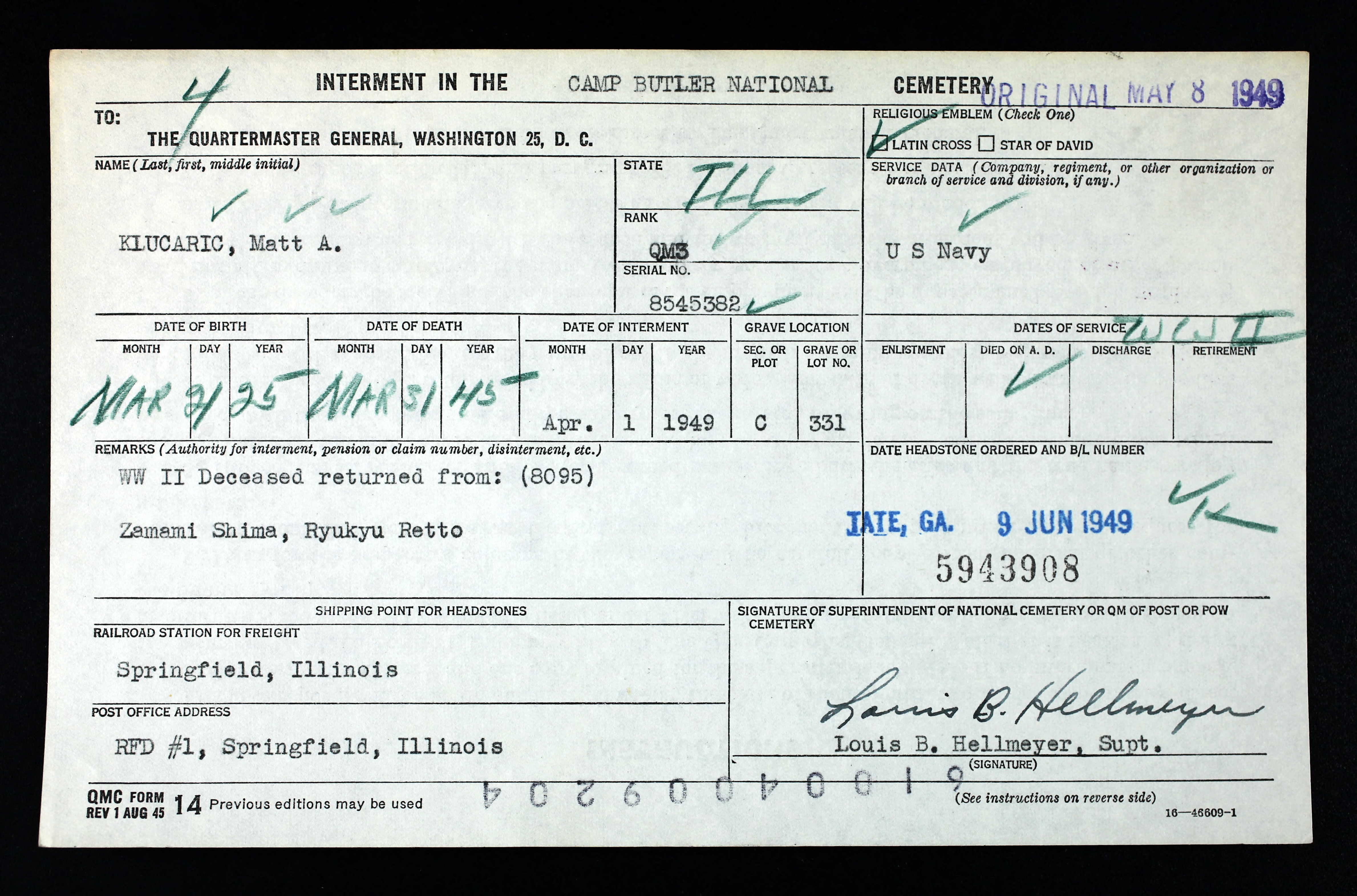 After the funeral services, Clarence's body was carried from Indianapolis by his shipmates for burial in the US Armed Forces Cemetery located on Zamami Shima, Kerama Retto, off the island of Okinawa.