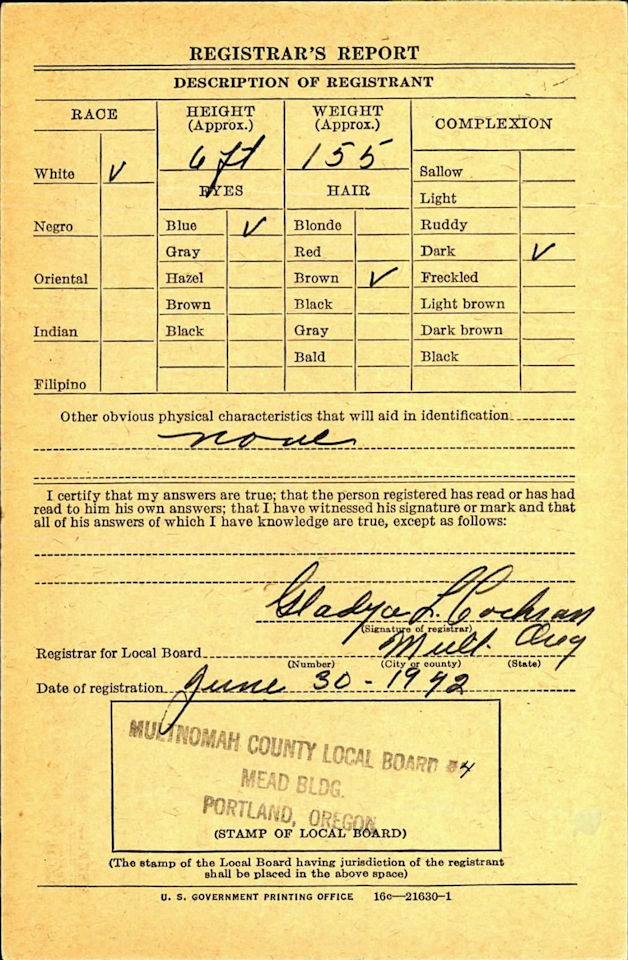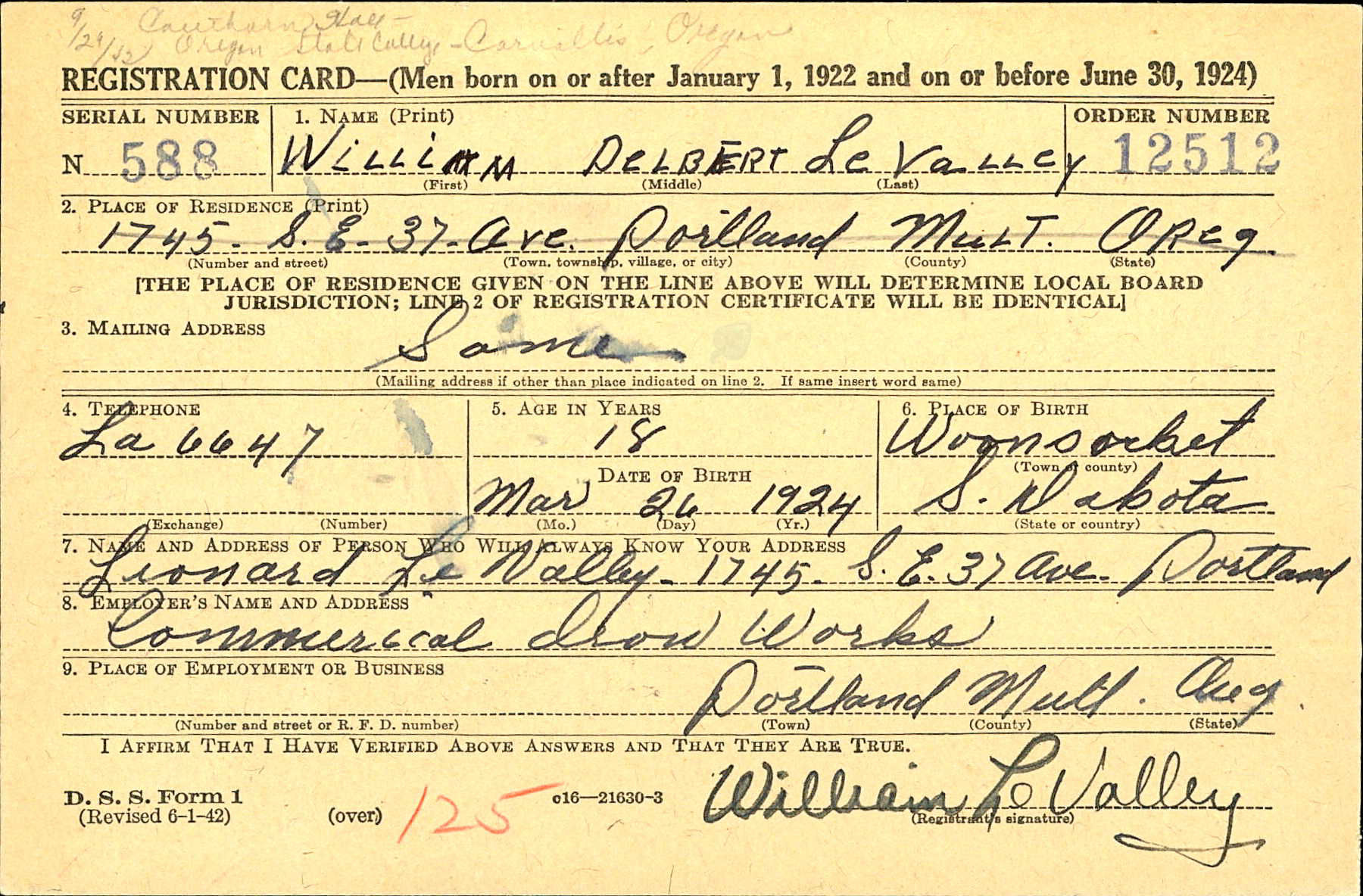 Bill graduated from Salem High School in 1941. He enrolled in Oregon State College, now Oregon State University, following graduation. On September 29, 1942, Bill entered the draft and enlisted in the U.S.N. on October 17, 1942.