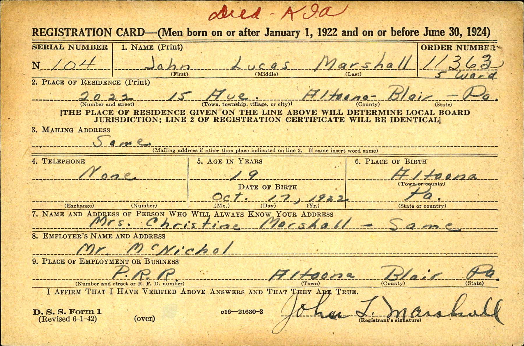 John Lucas Marshall was born on Oct. 17, 1922, in Altoona, and the son of Polish-speaking parents Michael and Christine Marshall, who had immigrated from Poland in the early 20th century.