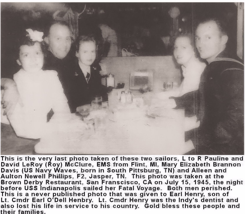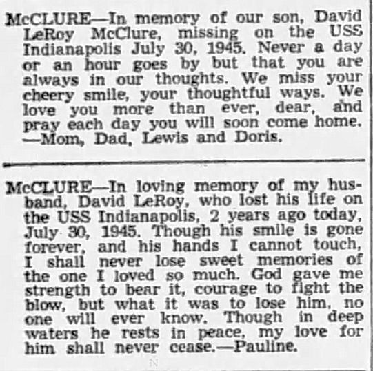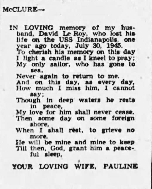 Name: David Leroy McCLURE Rank / Rating: EM2-Electrician's Mate Second Class Service #: 862 07 12 DOB: 1914 From: Flint, MI Parents: Went Aboard: Sep 01, 1943 Age When Ship Went Down: 31 Spouse: Pauline McClure Children: Grandchildren: Bio Submitted By: Admin Date Posted: