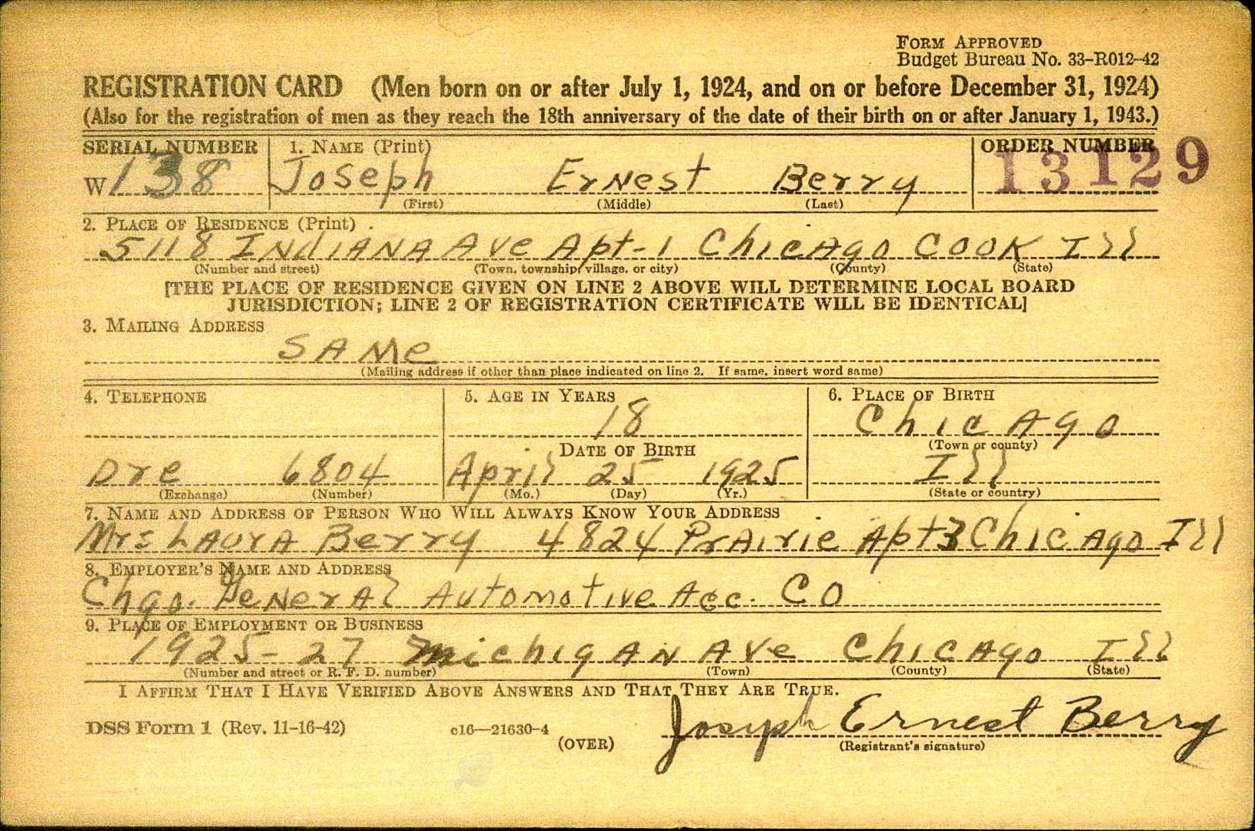 At the onset of this project, little was known about him, except his mother’s name, Fannie Eva Mason. She was listed as his next of kin and was living in Chicago at the time of his death. Other family information has been difficult to find. Berry, Jr. may have been among the six million African Americans who were part of the Great Migration movement from the rural south to northern industrial cities that occurred in the 1930s and 1940s.
