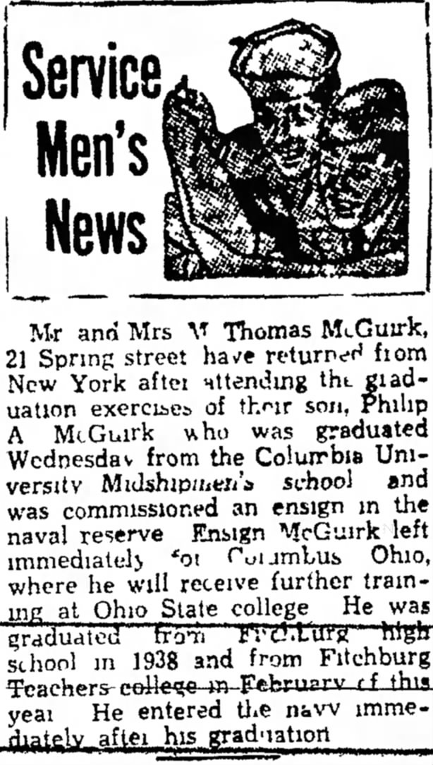 Navy Department, Casualty Section, Office of Public Information (1946): Combat Connected Naval Casualties, WWII, by States; Vol. AL-MO; MA, p. 29. Citing Philip Arthur McGuirk, Lieutenant, (jg), USNR. Parents Mr and Mrs Thomas McGuirk, 21 Spring St., Fitchburg.