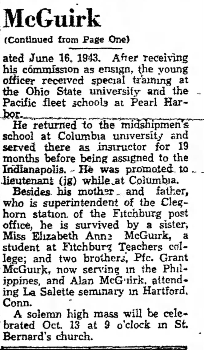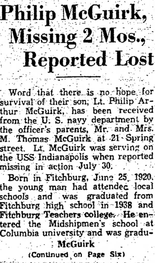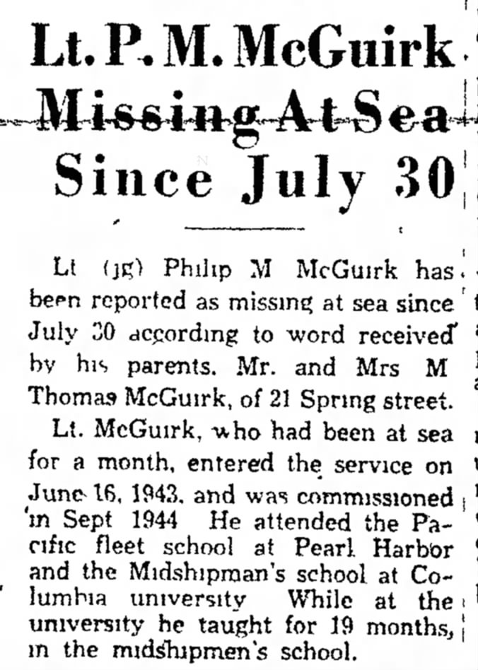 Fitchburg Sentinel, (Fitchburg, MA) Mon, Aug 13, 1945, p. 1. Citing McGuirk Missing at Sea