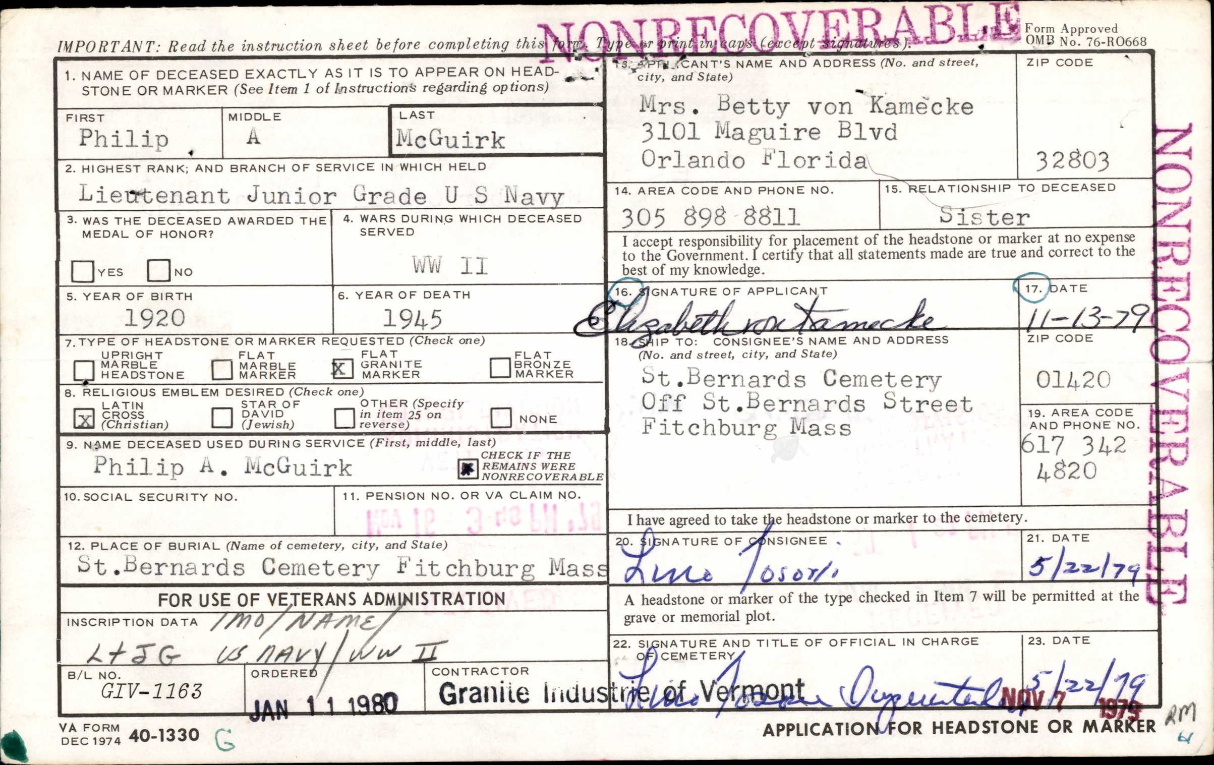 Fitchburg Sentinel (Fitchburg, MA) Tue, Oct 30, 1945, p. 2. Citing McGuirk Requiem High Mass