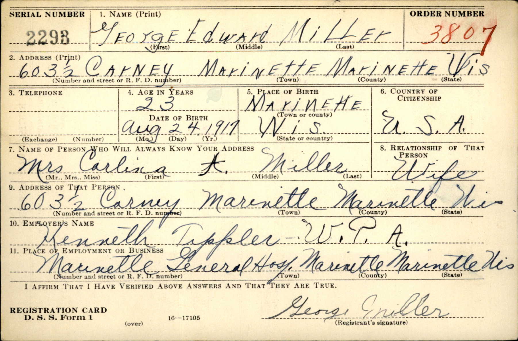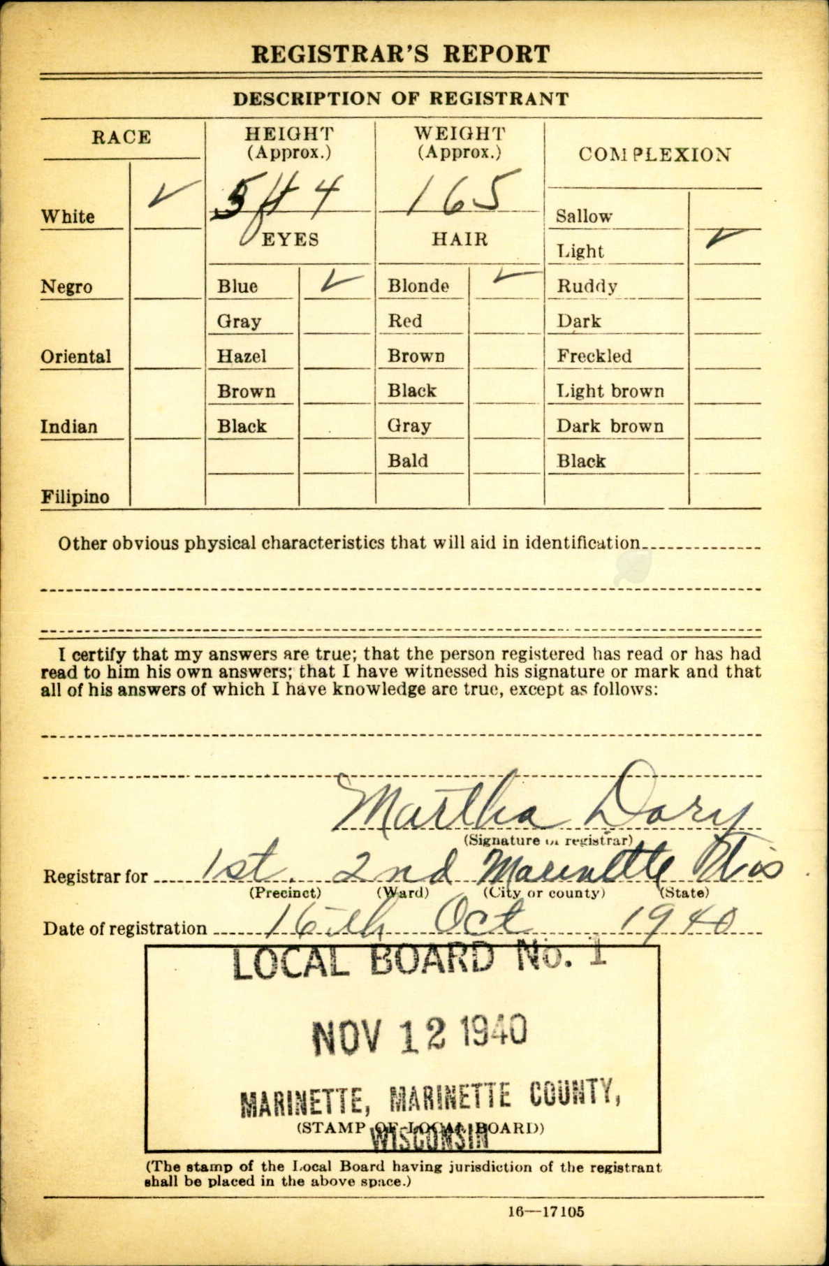 He registered for the WWII draft on October 16, 1940 at age 23. He was employed with the WPA Program working in Marinette General Hospital.