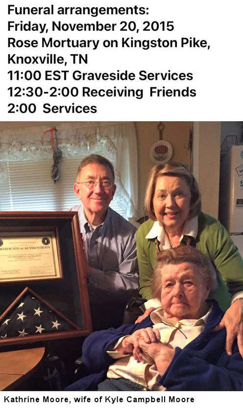 Katherine D. Moore (1915-2015) passed away on Saturday, November 14 in Knoxville, Tennessee at the age of 100. Teresa Brown, her granddaughter, called Earl, Jr., with this sad news.