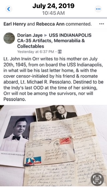 See additional photo below of Facebook posting of an envelope sent by Pessolano's friend and roommate. Enclosed in the envelope was the last letter written home by Lt John Irwin Orr.