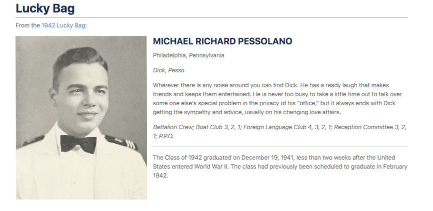 Pessolano’s bio in “LUCKY BAG” (1942 United States Naval Academy Yearbook) presented the following key information about him: