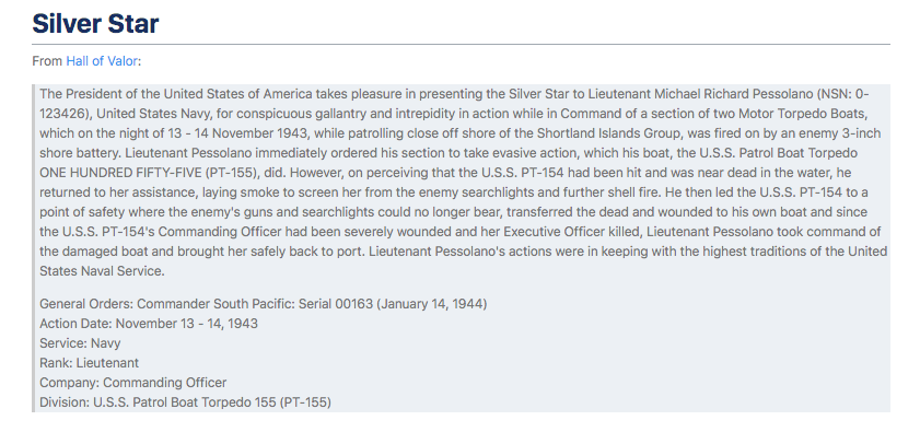 Lieutenant Michael R. Pessolano was awarded the Silver Star for conspicuous gallantry and intrepidity in action while in Command of a section of two Motor Torpedo Boats. Read the full story by viewing the Silver Star summary that is posted in the “Additional Photos” section below. (3)