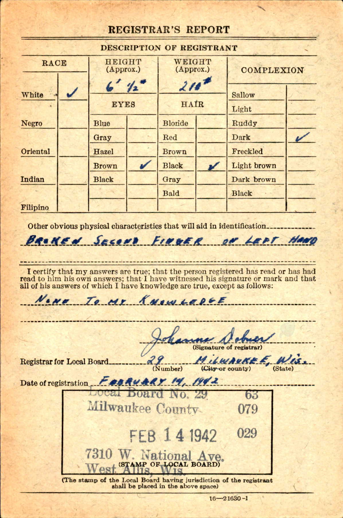 George registered for the draft on Feb 14, 1942, in Milwaukee. He was 21 years old and living in Greenfield, Milwaukee, WI.