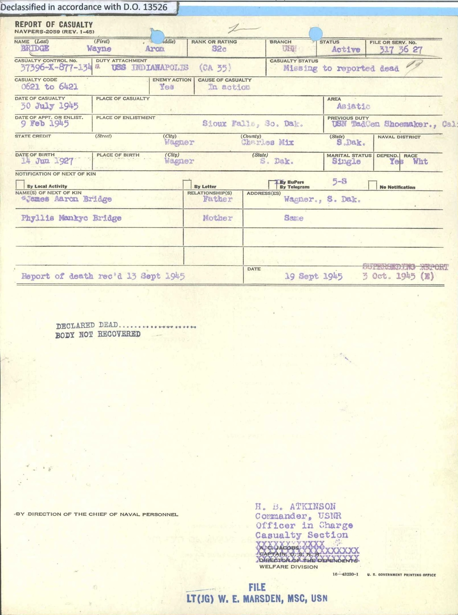Wayne Bridge - US Navy WW1I 1945 - lost at sea MIA