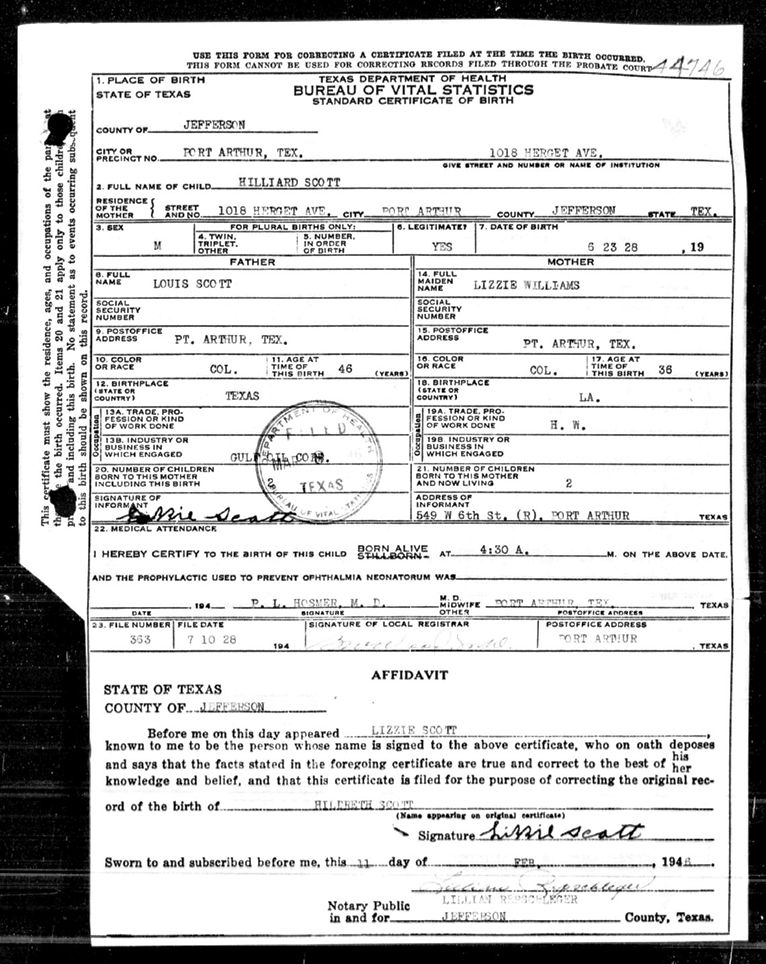 Hilliard Scott came into the world on 23 June 1928 in Port Arthur, Texas. According to the 1940 U.S. Census, he lived with his father Louis, and mother, Lizzie, who was employed as a home aide nurse.