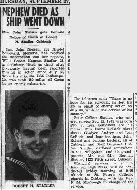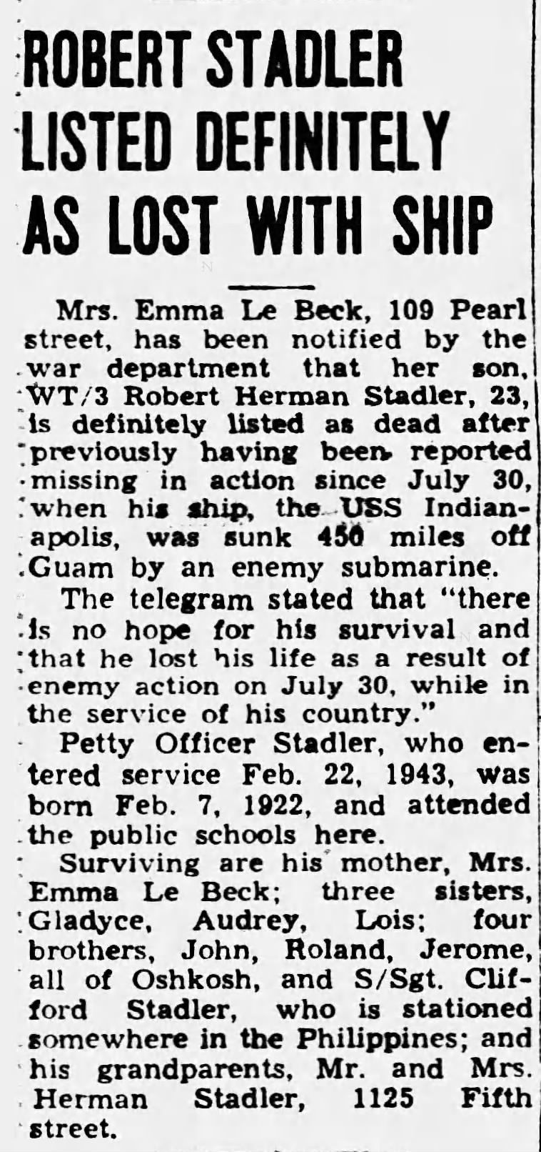 He is survived by his mother, Mrs. Emma LeBeck; three sisters, Gladyce, Audrey and Lois LeBeck; four brothers, John, Roland and Jerome LeBeck, allof Oshkosh, and Staff Sergeant Clifford Stadler, stationed somewhere in the Philippines. His grandparents were: Mr. and Mrs. Herman Stadler.
