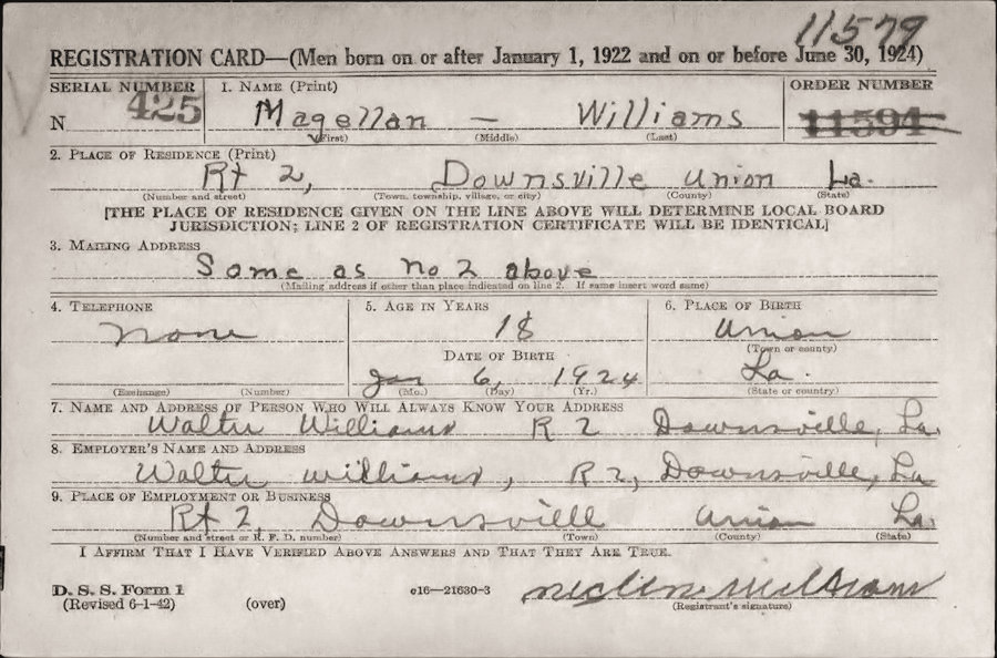 Magellan Williams was 18 years old when he registered for the draft on 30 June 1942. At age 20, Magellan enlisted in the U.S. Navy in Shreveport, Louisiana on 10 February 1944.