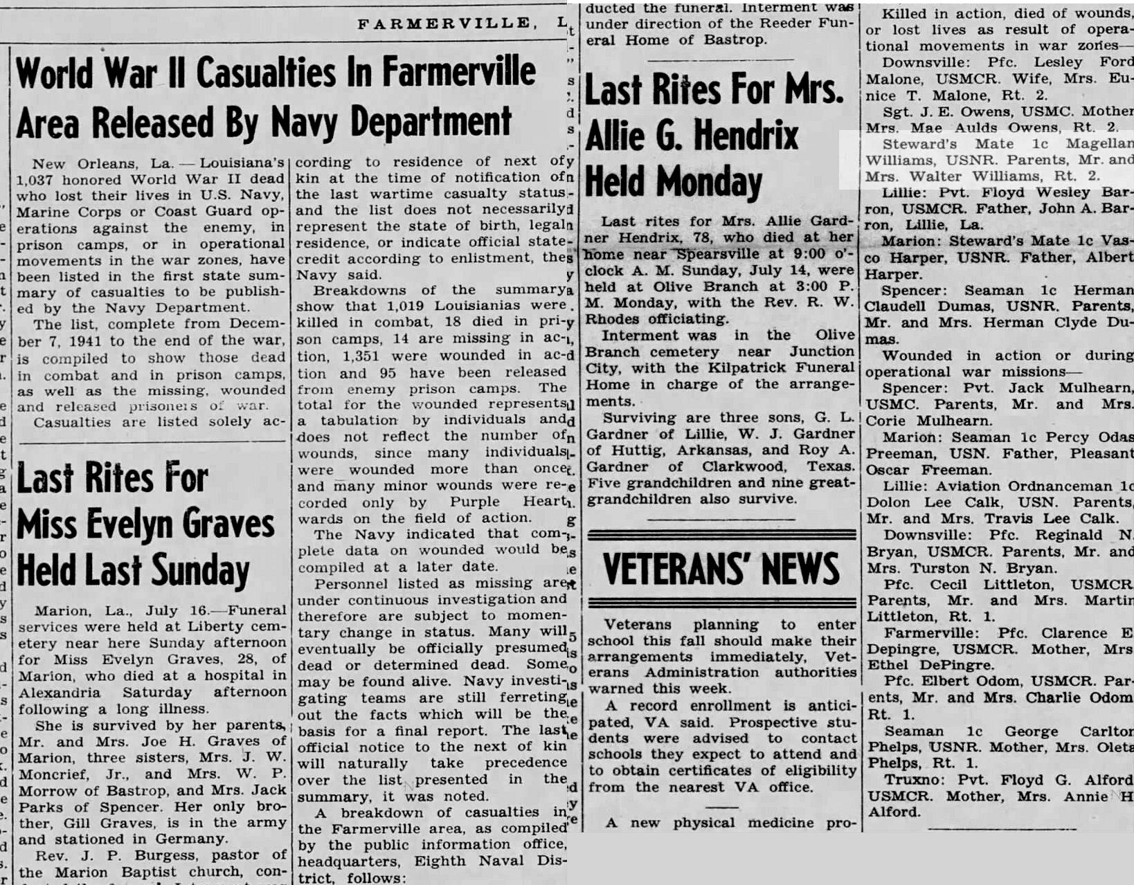 News of his death was published in The Gazette in nearby Farmerville, Louisiana, one year after the sinking on 16 July 1946 after the Navy Department had released the World War II cumulative casualty lists by state.